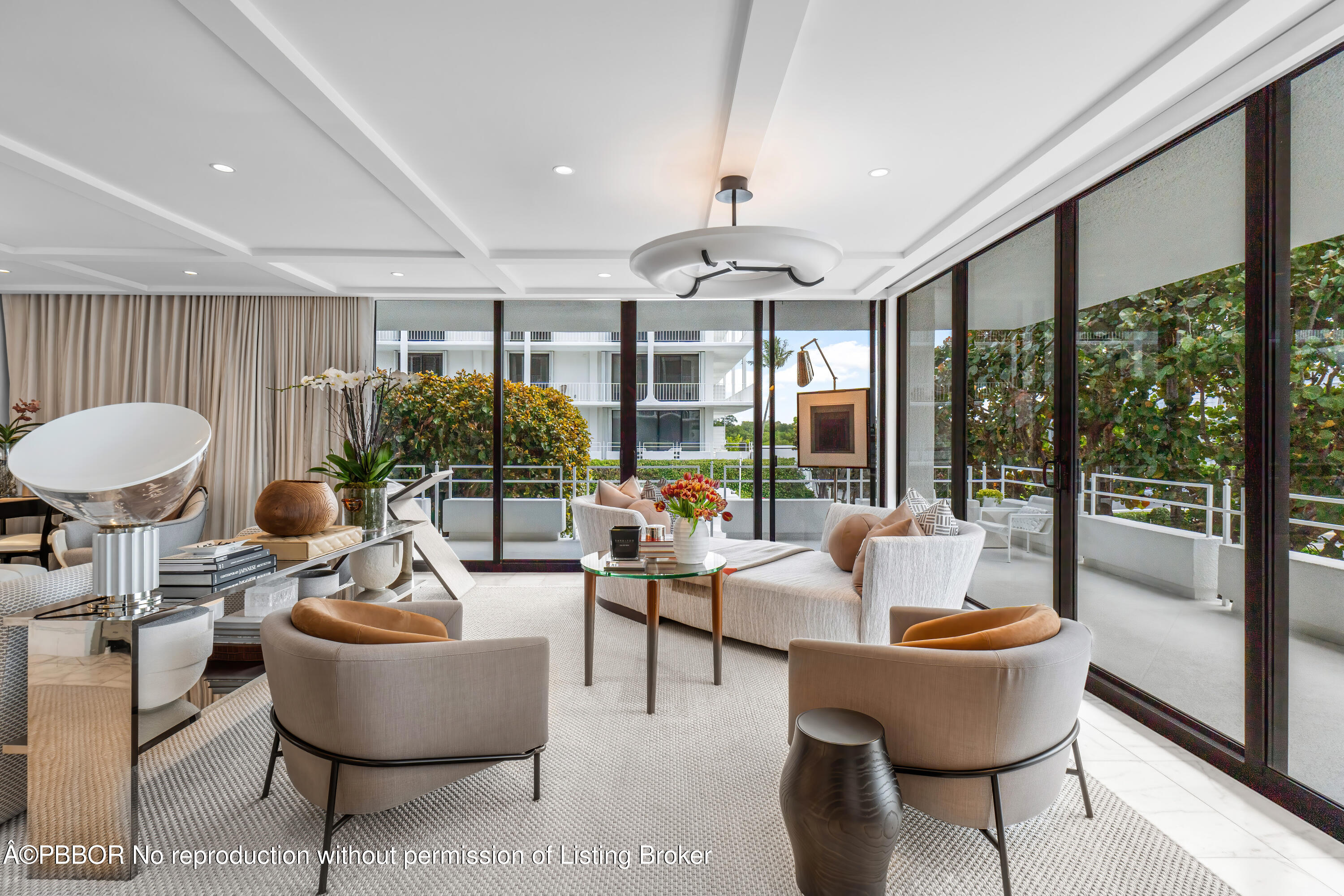 Experience the ultimate in elegance and tranquility with this newly renovated corner residence, perfectly positioned on an exclusive and secure island in Palm Beach. Just steps from the pristine beach and town tennis center, this contemporary home is designed for those who appreciate refined living in a premier location. From the moment you enter, you'll be welcomed by an atmosphere of sophistication and serenity. The expansive open floor plan boasts soaring 9-foot ceilings, stunning Dolomite Bianco Italian marble, exquisite Venetian plaster walls, and state-of-the-art Lutron lighting—every detail meticulously curated for a luxurious lifestyle. Floor-to-ceiling impact glass doors bathe the interiors in natural light and open onto a sprawling wraparound balcony, where breathtaking Intracoastal views and lush tropical landscaping create an idyllic setting for outdoor living and entertaining.