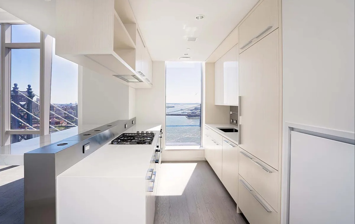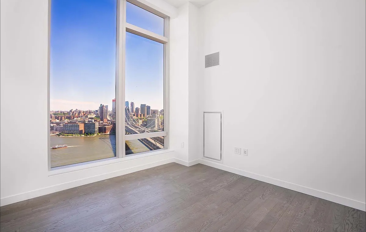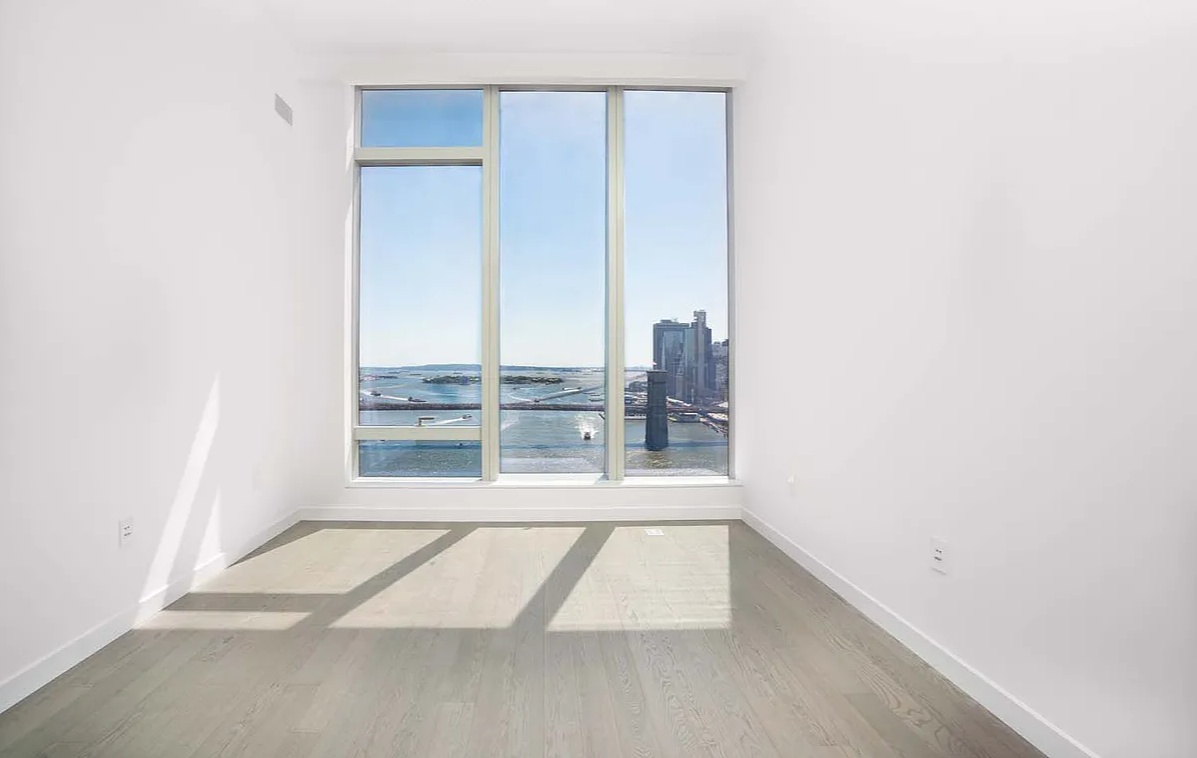 This Residence features stunning views of Financial District, imported stone and custom finishes, floor to ceiling windows, 5 wide stained oak flooring, in unit washer and dryer, a beautiful open windowed kitchen with breakfast bar & premium Miele appliance package; it faces South East and has spectacular iconic Manhattan Bridge, FiDi, and East River views. Master bathroom has custom wood cabinetry, marble tile walls and mosaic floors with radiant heat, under-mount Wetstyle sink with glass vanity top and Dornbracht polished chrome faucets.