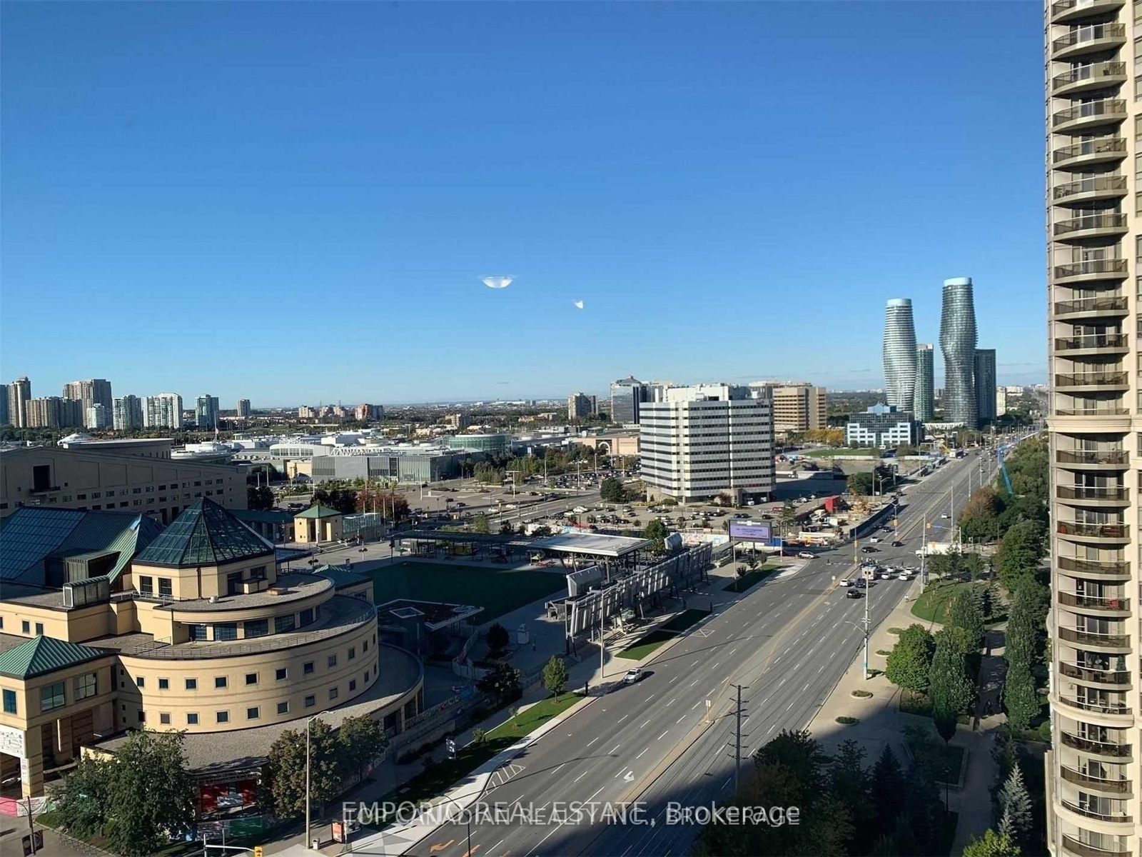 The Best Layout In The Building With 2+1 Bedrooms And Two Washrooms Corner Unit, Den With French Doors Can Be Used As A Third Bedroom Or Office With Big Windows. 9" Ceilings,Laminate Flooring Throughout, Modern Kitchen W/Granite Counter & Centre Island. Amazing View Overlooks Celebration Square, Living Arts Centre, Library, Ymca, Square One, Excellent Access To Highways And Transit. Two Parking Spots And Locker.