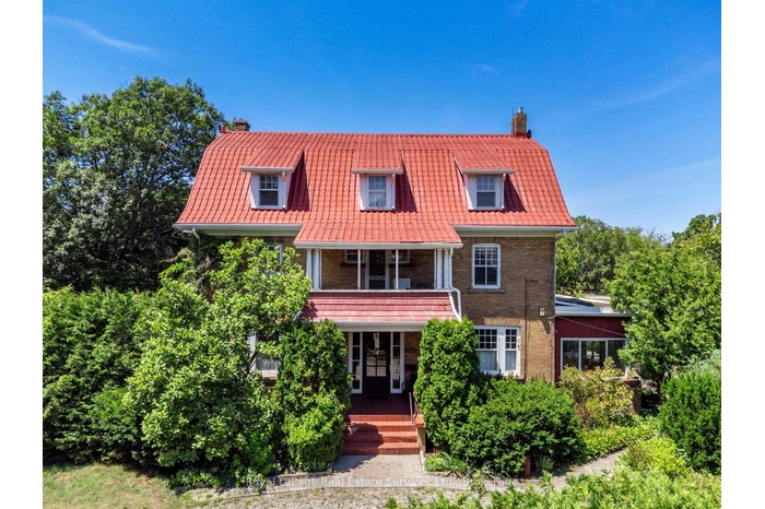 Welcome to the landmark Cudmore Farm House in south Oakville with almost 150 of frontage on Lakeshore Road West. An extremely private 1/3 acre estate property with circular driveway entrance to a grand 3-storey residence with over 3750 square feet of living space above-grade. Built on a solid poured-concrete foundation with brick construction and steel roof, this home is very livable but ready for renovations to create a contemporary home for the next generation. The beautiful front foyer is a grand entry hall with Arts & Crafts staircase giving understated Downton Abbey vibes. The current owners updated the residence with an open concept kitchen/family dining room across the west side of the house which is flooded with sunlight. The kitchen features some cool, vintage mid-century modern appliances, a centre island and a gas fireplace. The beautiful formal living room is lined with rare cypress tongue & groove panelling and features a brick gas fireplace, stained glass french doors and opens to a library with built-in glass bookcases. Two patio doors lead to a large sunroom which spans the east side of the house. Incredible original features include second floor sleeping porches on both the front and rear of the house and a back staircase for servants. 4.5 bathrooms and a total of 7 bedrooms on the second and third floors. The primary suite in the southwest corner has a dressing room and a large ensuite bathroom with glass walk-in shower. Second floor laundry room. High ceilings and hardwood floors throughout. Newer forced air gas furnace and central air conditioning. For the price of a subdivision house, this exceptional large property and grand 3 storey home is a place for a family to re-imagine, grow into and cherish for a lifetime. Walking distance to Bronte Village, the harbour and the beach. Tour this exciting property and discover how it could become your dream home.
