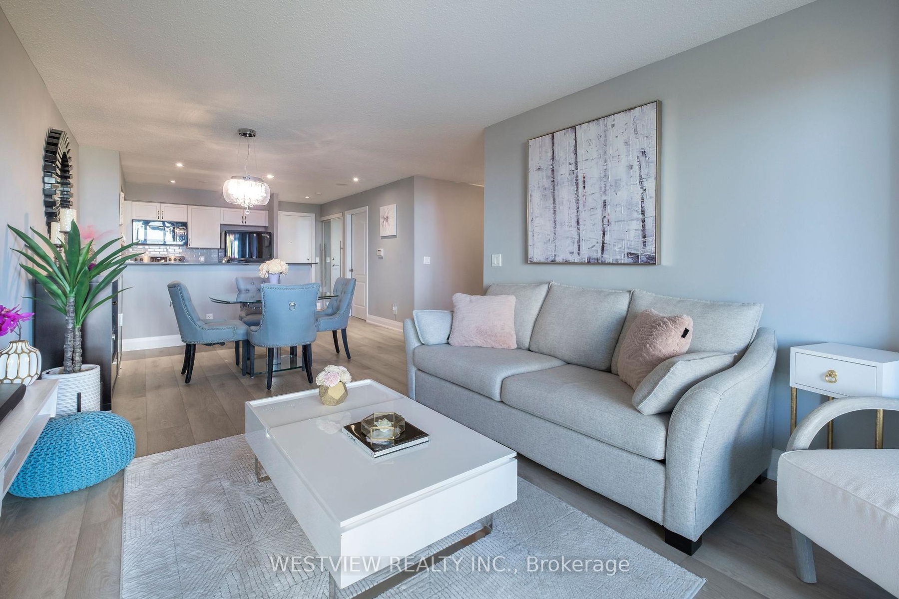 A beautifully appointed & tastefully renovated, large one bedroom plus den waterfront condo in Voyager 2. Overlooking picturesque Jean Augustine Park, the lake & city skyline. Features two separate walk-outs to your private 110 Sqft tiled balcony, where you can enjoy your morning coffee & vibrant fall colours as they blend in with the blue waters of the lake. Same vantage point offered from the large bedroom! Unit Features a very welcoming & practical floor plan approx 800sqft, allowing for you to comfortably lay out your dining & living area to suit your needs. The large & multi-functional separate den area features custom built-in cabinetry with plenty of room for your desk, ideal for a home office. A Modern kitchen overlooking the expansive living area, includes granite counters, upgraded cabinets, new backsplash, pot-lights & breakfast bar. New premium wide plank vinyl flooring & upgraded light fixtures throughout that brighten up the entire space. The renovated 4pc washroom also features a rare separate laundry room with additional built-in storage space/ shelving. Absolutely stunning unit that you will look forward to coming home to. Meticulously maintained owner occupied unit. Includes one parking spot & storage locker along with all utilities being included.