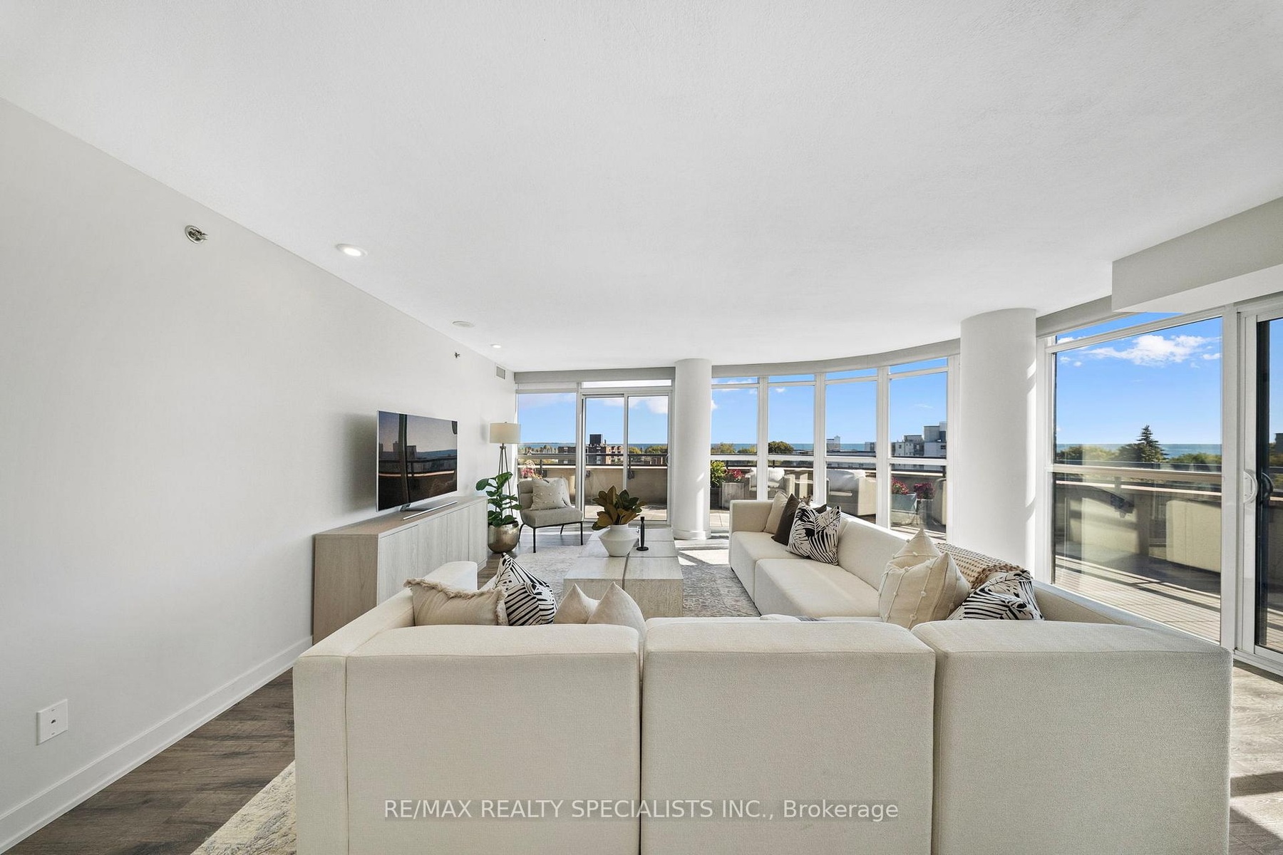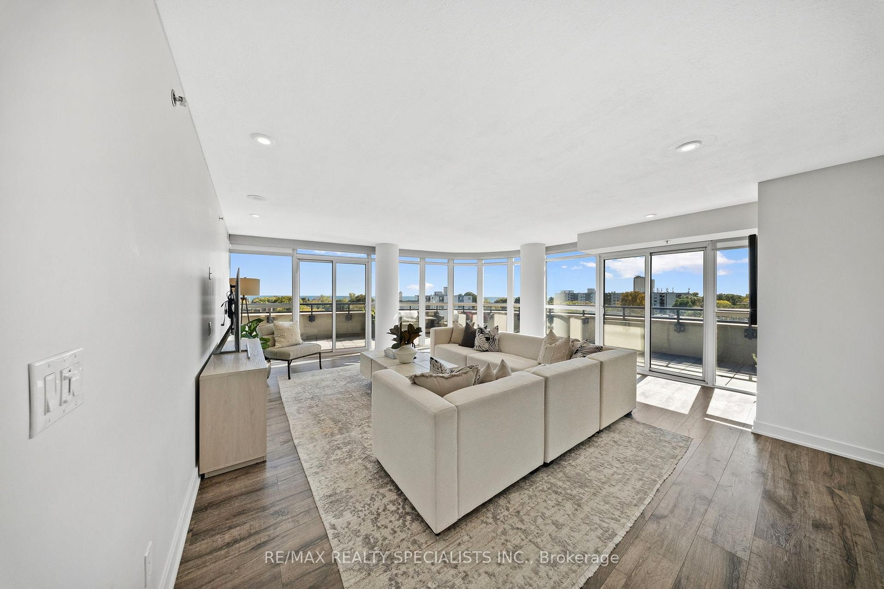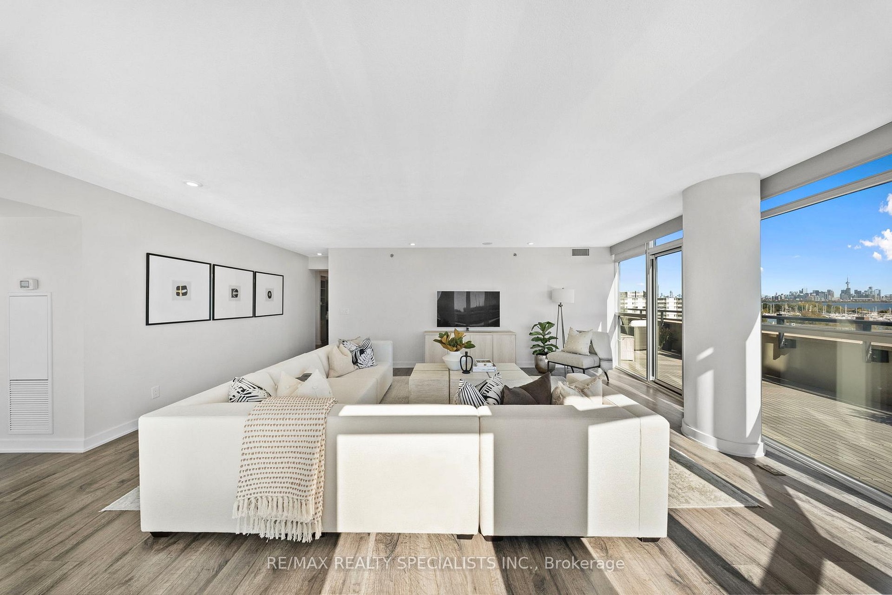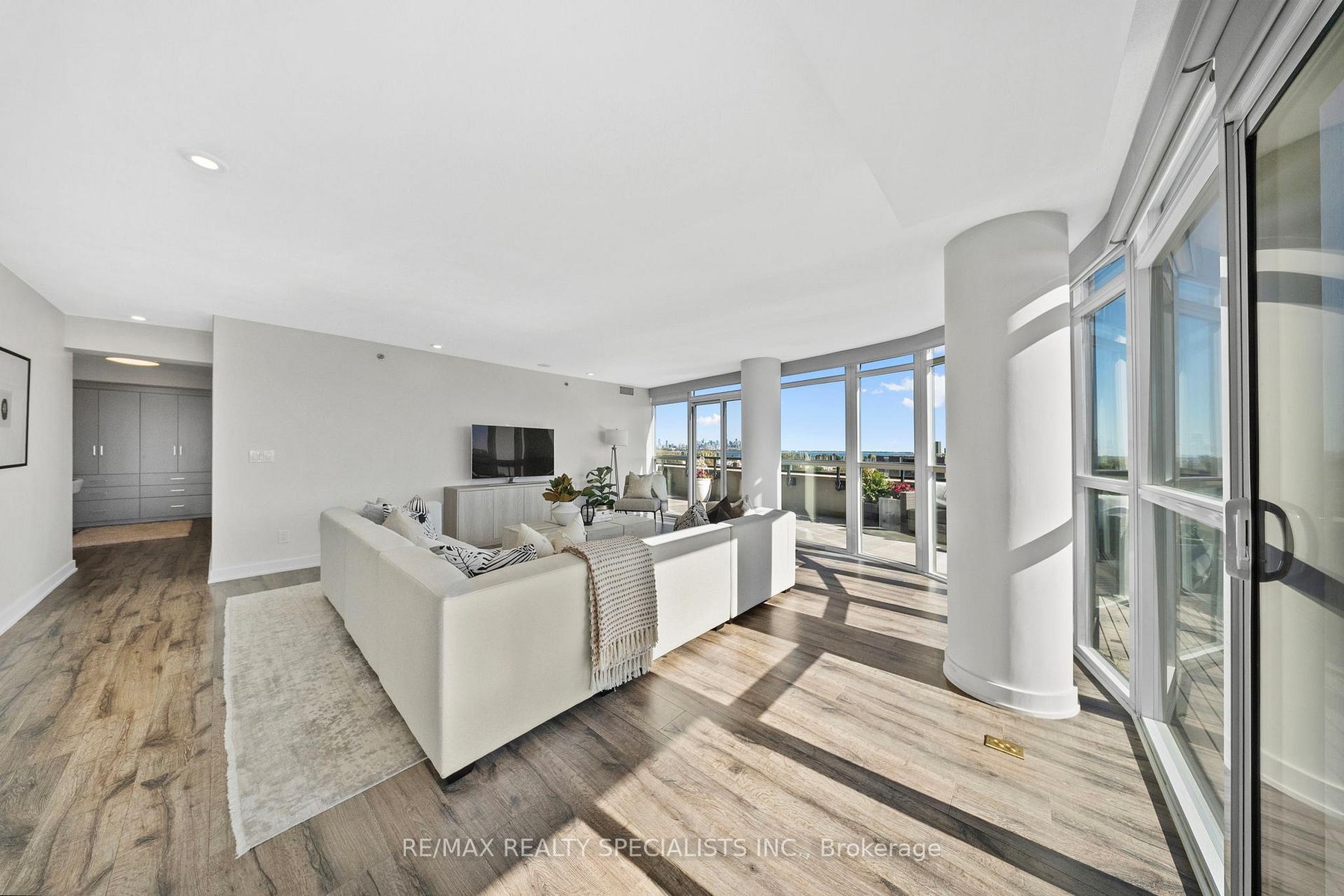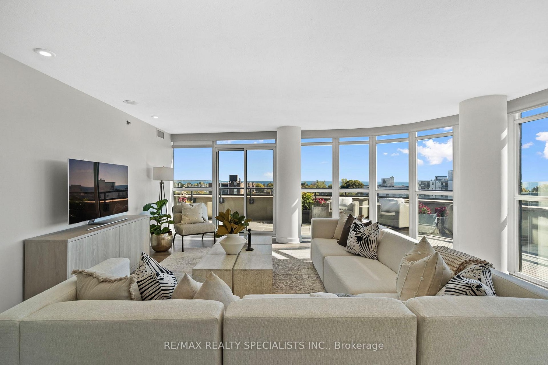 Stretching across the full width of this double unit, this modern home is anchored by one of the largest private terraces at 11 Superior - a wraparound sanctuary with panoramic views of the lake, yacht club, and Toronto skyline. Equally suited for lively family gatherings or lazy mornings with coffee and pancakes, this Penthouse-like seventh-floor suite redefines luxury living in Mimico with a rare sense of warmth, comfort, and connection. Custom designed as a double-unit master statement, this 2+1 bedroom, 2-bath residence with 2 parking spaces and 2 lockers strikes a perfect balance between sophistication and practicality. The grand salon, the heart of the home, is framed by floor-to-ceiling glass and a curved architectural wall-ideal for entertaining, family moments, or even an impromptu piano performance.The full-sized kitchen flows effortlessly into an open dining area large enough to host holiday dinners. The primary suite is a true retreat with terrace access, a walk-in closet, custom cabinetry, and a spa-inspired ensuite that invites relaxation. 2nd bed bring loft like feel with barn door and built-ins. The +1 bed/den offers versatility-perfect for guests, work, or creative projects-while also performing as a formal den and mudroom, adding huge practicality with built-ins and a dedicated laundry station. Convenience meets function with two side-by-side parking spaces and two lockers-an exceptionally rare find in boutique condominium living. Beyond its walls, 11 Superior remains one of Mimico's most celebrated addresses, offering unmatched access to the waterfront, parks, trails, shops and restaurants, TTC, and the Mimico GO Station. This is more than a condo-it's a home in a village that welcomes gathering, celebrates design, and captures the essence of refined, connected living by the lake.