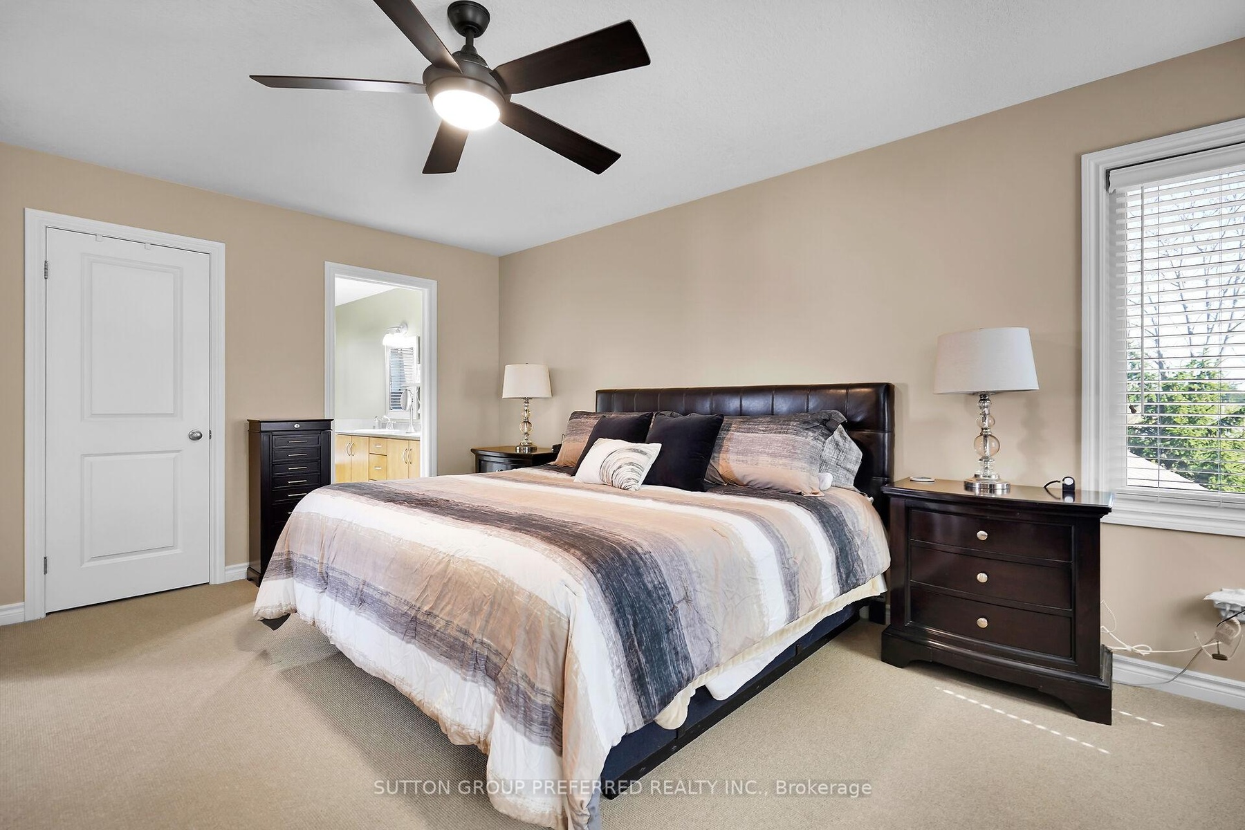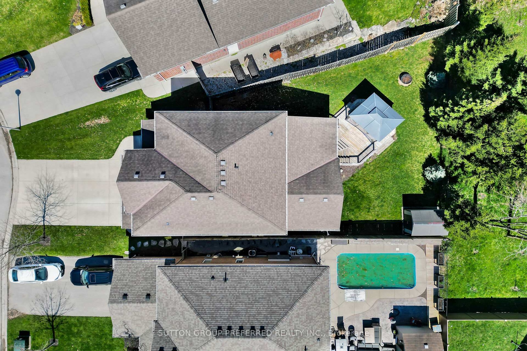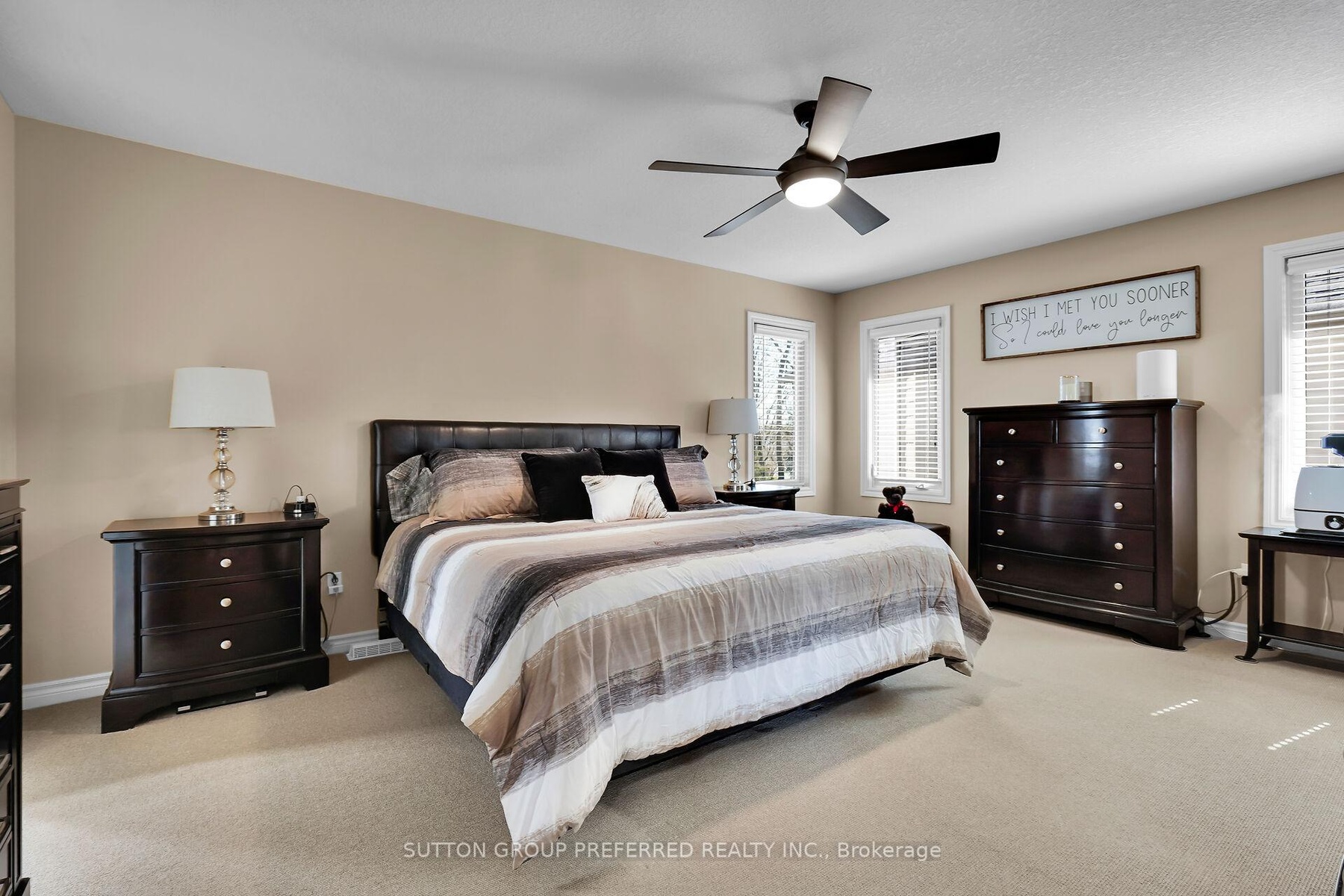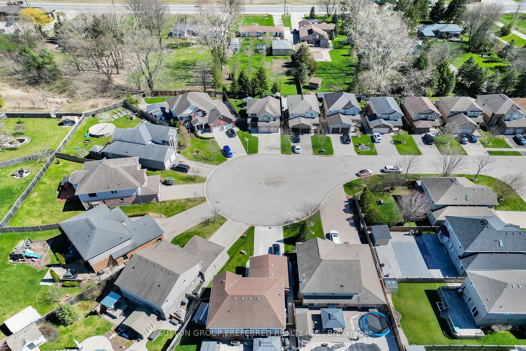 Spectacular Lambeth Court location with pie lot. Stunning curb appeal. This former Artisan model home comes fully finished. Gracious Open foyer welcomes you inside, Enjoy the 9ft ceilings throughout main, main floor laundry, custom kitchen with granite counters overlooking family room with gas fireplace, dining room, and eating area with terrace doors to 2-tiered deck with gazebo. Fully fenced yard, very private. 3 large bedrooms upstairs with primary bedroom with walk-in closet and private 5-piece ensuite bath, also Jack & Jill 4-piece bath between the 2 other bedrooms. Lower-level games room and rec-room, plus bedroom and 4-piece bath, wired for 5.1 surround sound. All standing cabinets included in basement hallway. Wrought iron railings, transom windows.