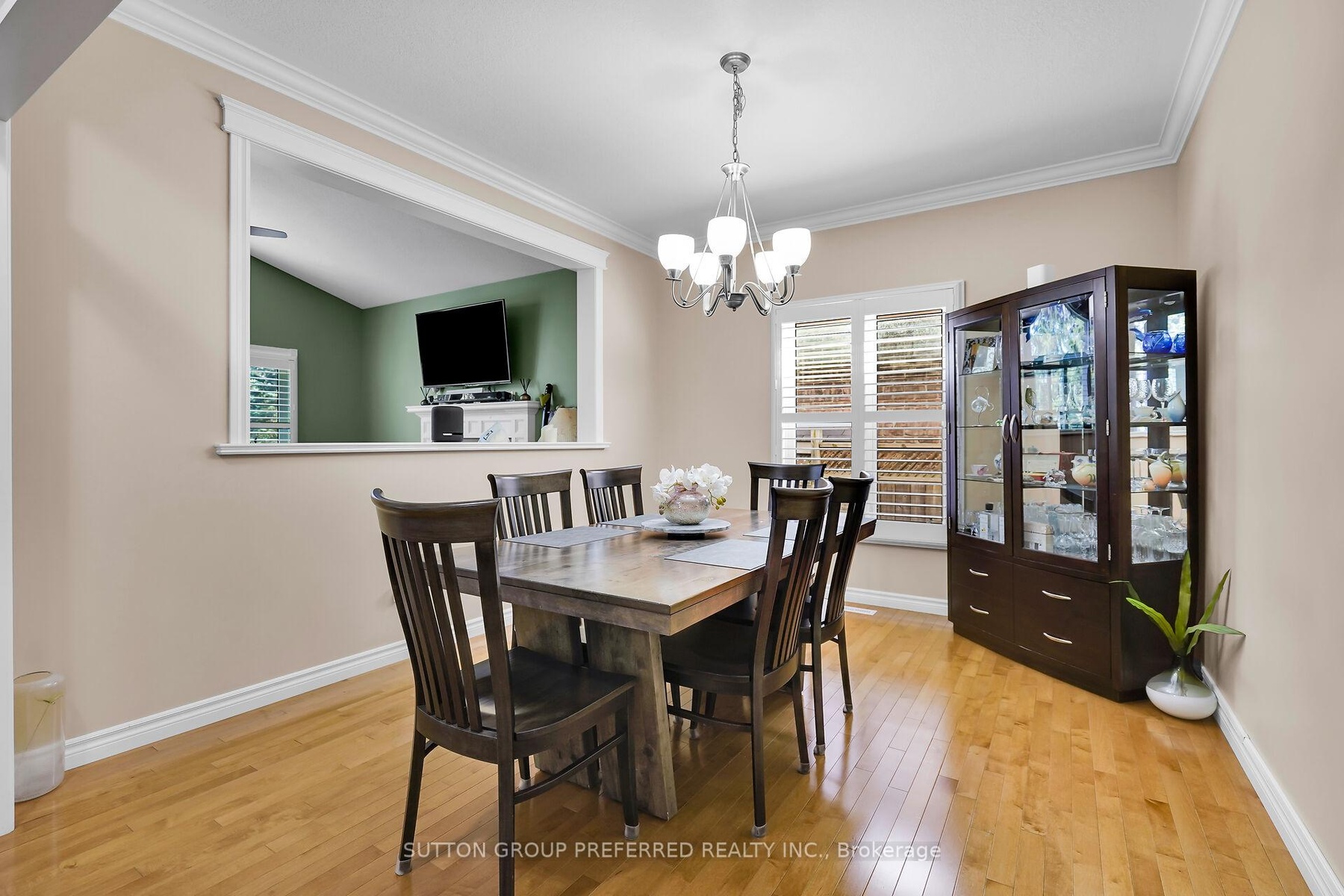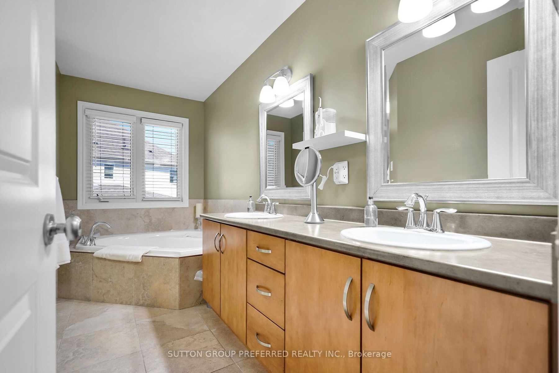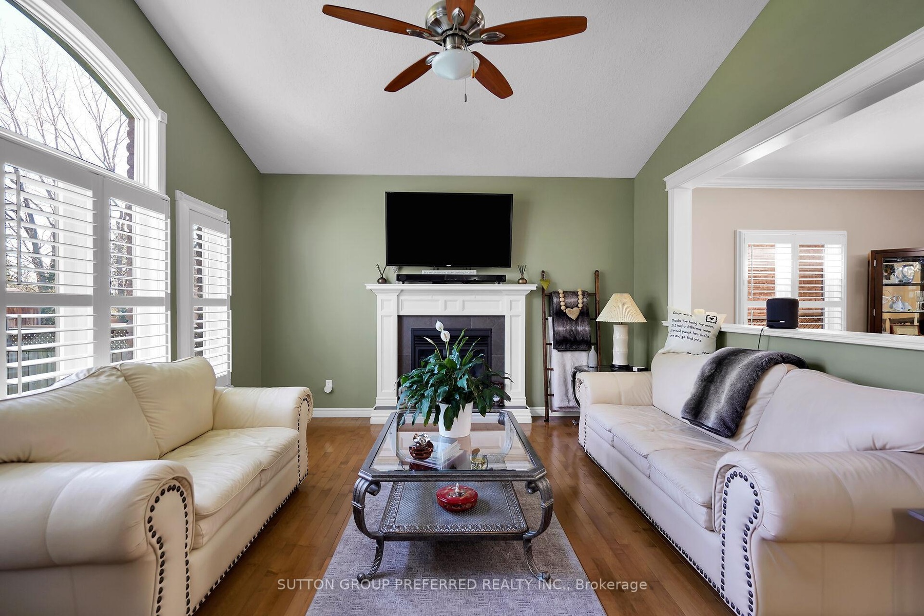 Spectacular Lambeth Court location with pie lot. Stunning curb appeal. This former Artisan model home comes fully finished. Gracious Open foyer welcomes you inside, Enjoy the 9ft ceilings throughout main, main floor laundry, custom kitchen with granite counters overlooking family room with gas fireplace, dining room, and eating area with terrace doors to 2-tiered deck with gazebo. Fully fenced yard, very private. 3 large bedrooms upstairs with primary bedroom with walk-in closet and private 5-piece ensuite bath, also Jack & Jill 4-piece bath between the 2 other bedrooms. Lower-level games room and rec-room, plus bedroom and 4-piece bath, wired for 5.1 surround sound. All standing cabinets included in basement hallway. Wrought iron railings, transom windows.