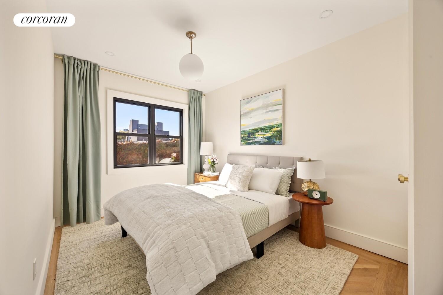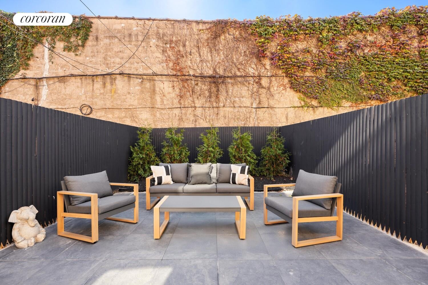 Head up the stoop to a parlor floor that features a spacious and sunny living room, a full bathroom, and a rear windowed south-facing chef's kitchen with a formal dining area and an easy walk-out to the spacious garden. The generous kitchen features modern micro-shaker oak cabinetry with honed countertops and backsplash. A high-end appliance suite features Italian-made Bertazzoni and even includes a vented range hood. Aged brass faucets and cabinet hardware complete this modern yet timeless look.
