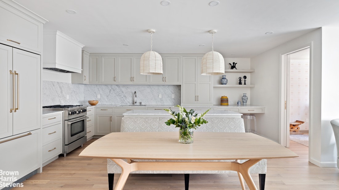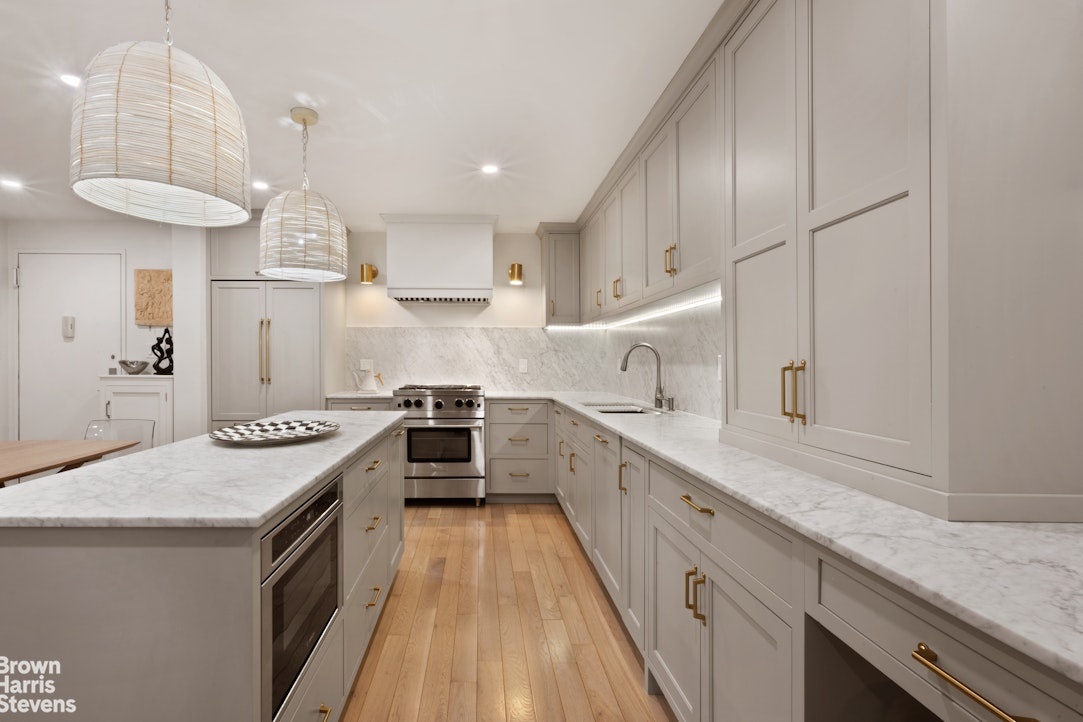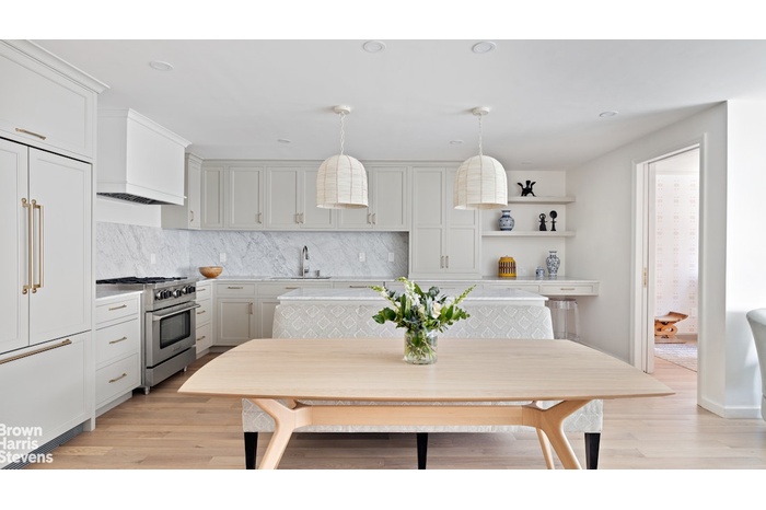 At the heart of the home is the showstopper kitchen that will delight any culinary enthusiast.  A totally customized layout like no other in the building, designed with honed Carrara marble countertops, custom cabinetry, and an outstanding suite of premium appliances - including a Bluestar oven, Fisher & Paykel refrigerator, Thermador dishwasher and Bosch microwave - this kitchen is as functional as it is breathtaking.