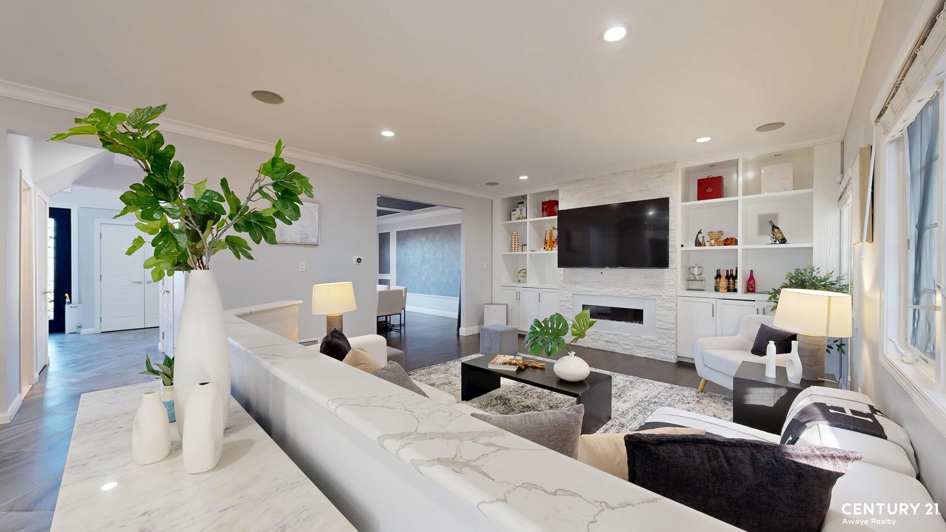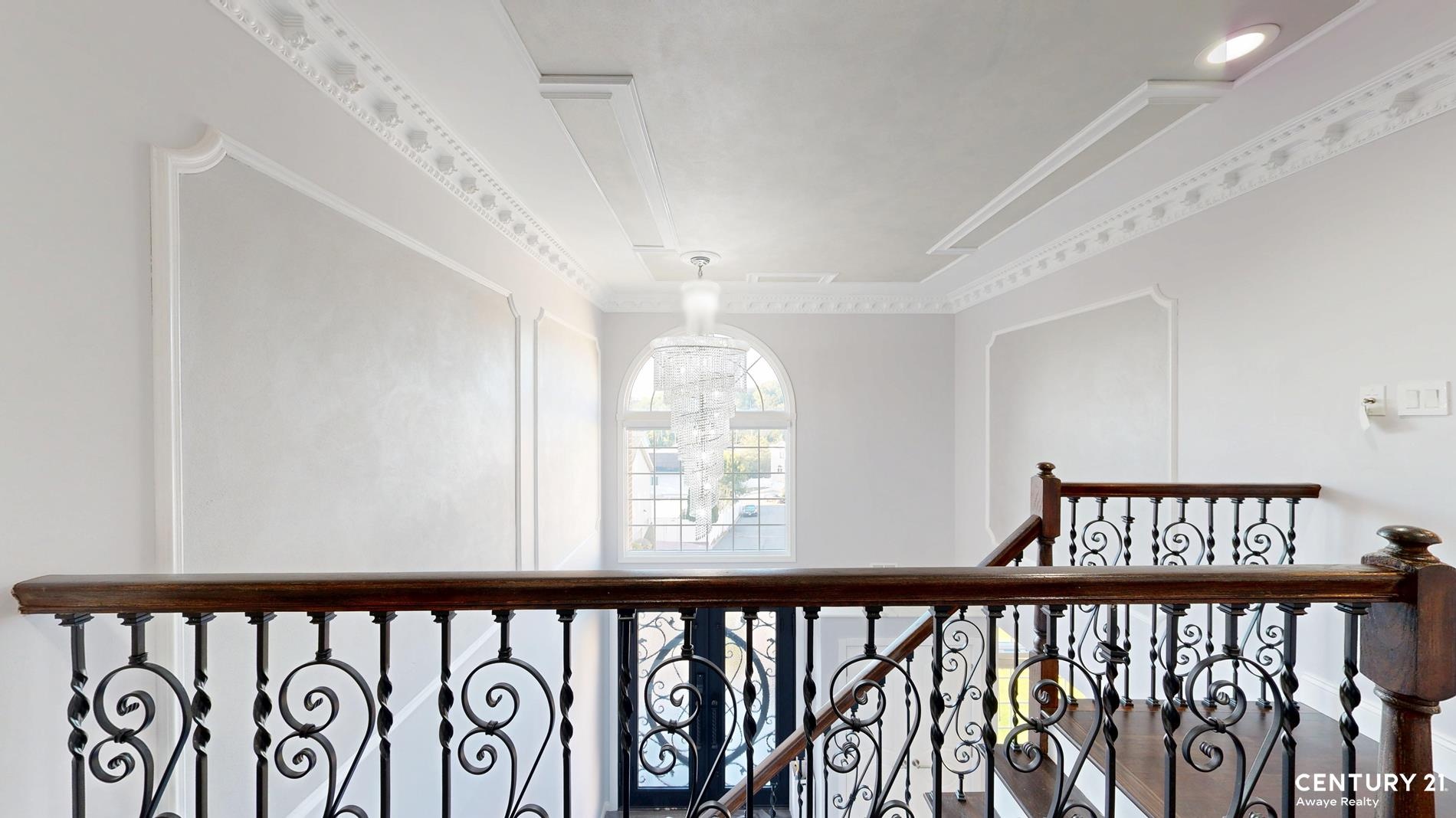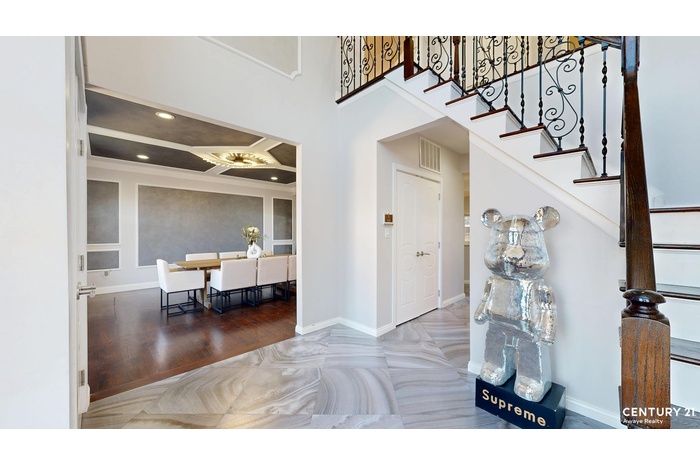 Step through the grand double doors into a home adorned with beautiful crown moldings, vaulted ceilings, and luxury hardwood floors throughout. The spacious living room is highlighted by an electric fireplace, creating an inviting ambiance for both relaxing and entertaining. This residence boasts six generously sized bedrooms, including a primary suite with a spa-like en-suite bathroom, and three additional exquisitely renovated bathrooms, all designed for comfort and elegance.