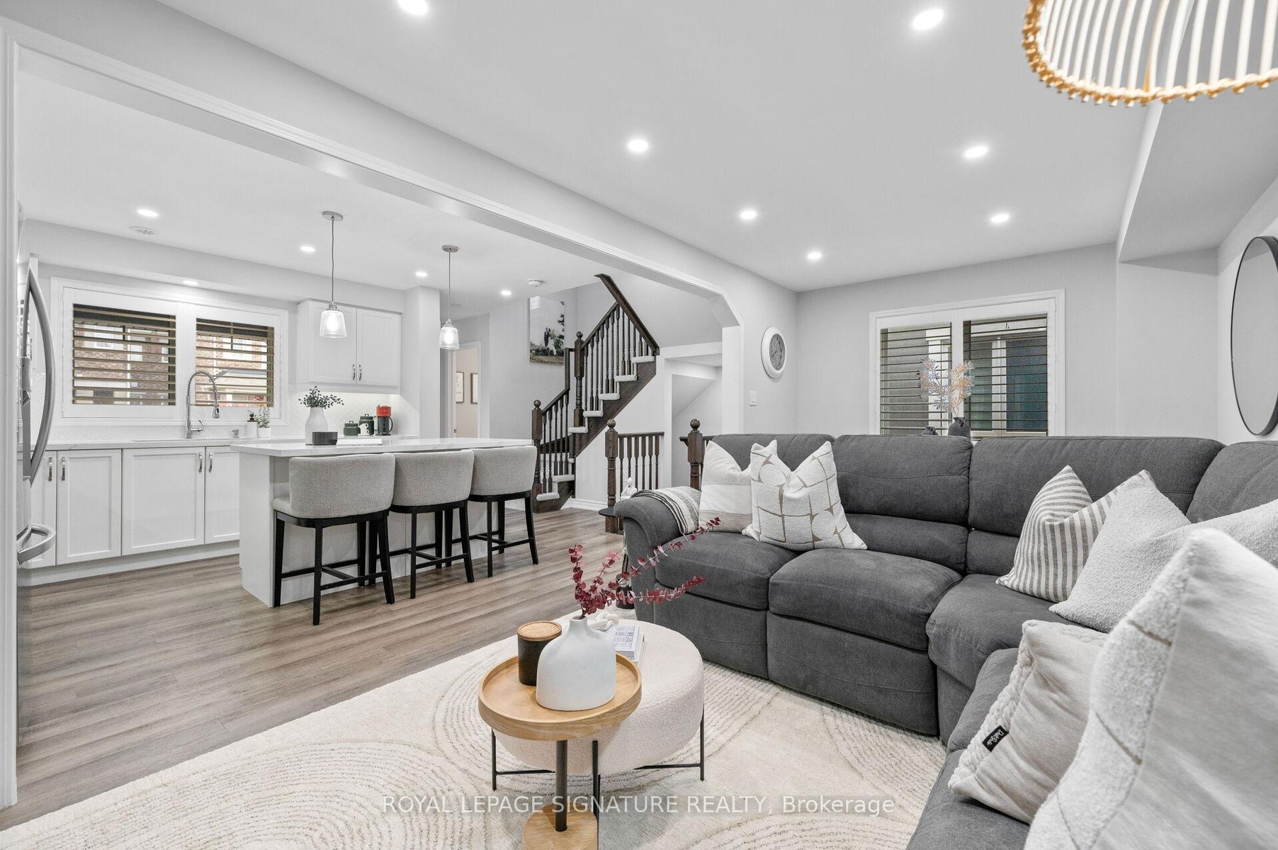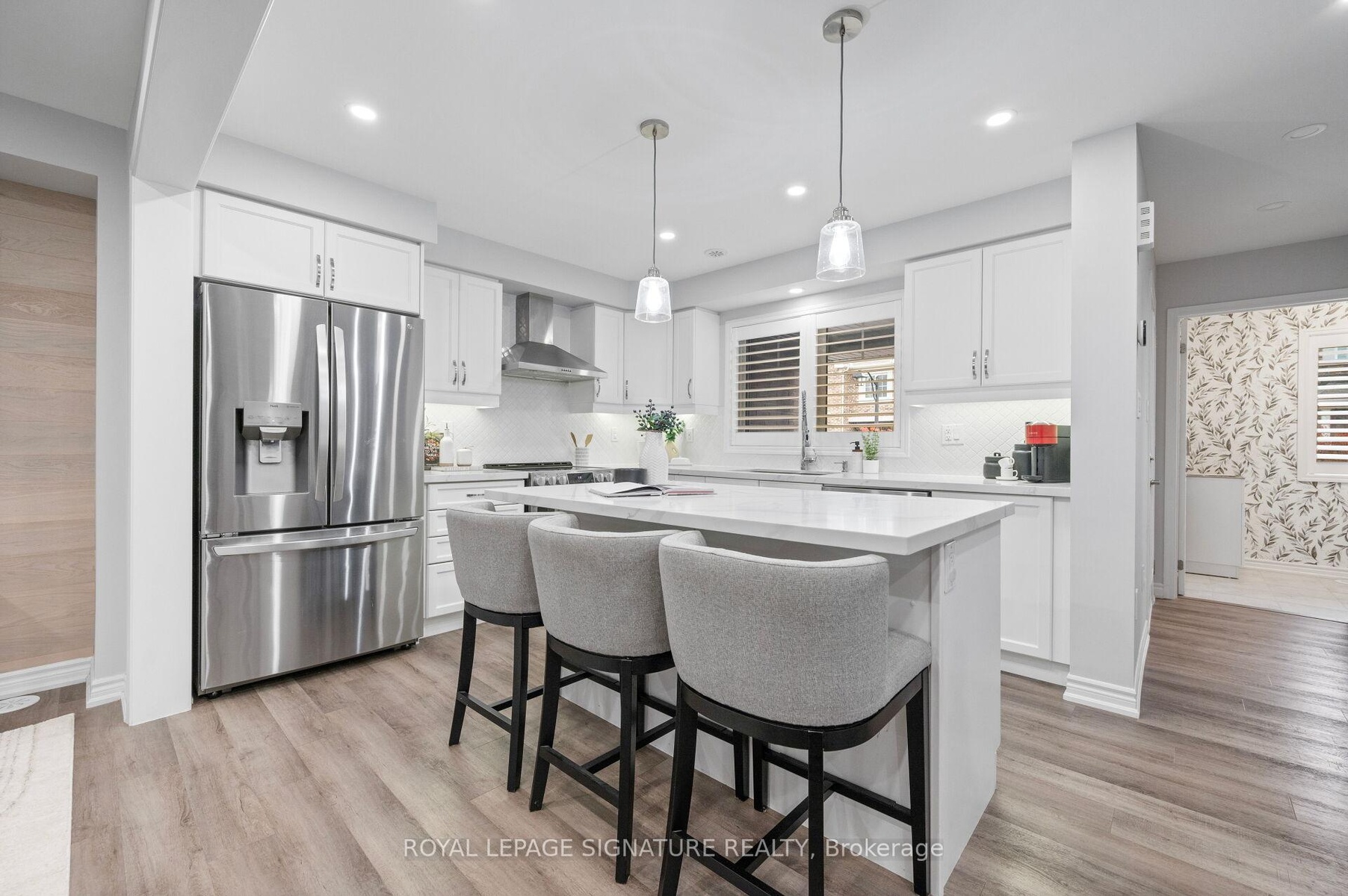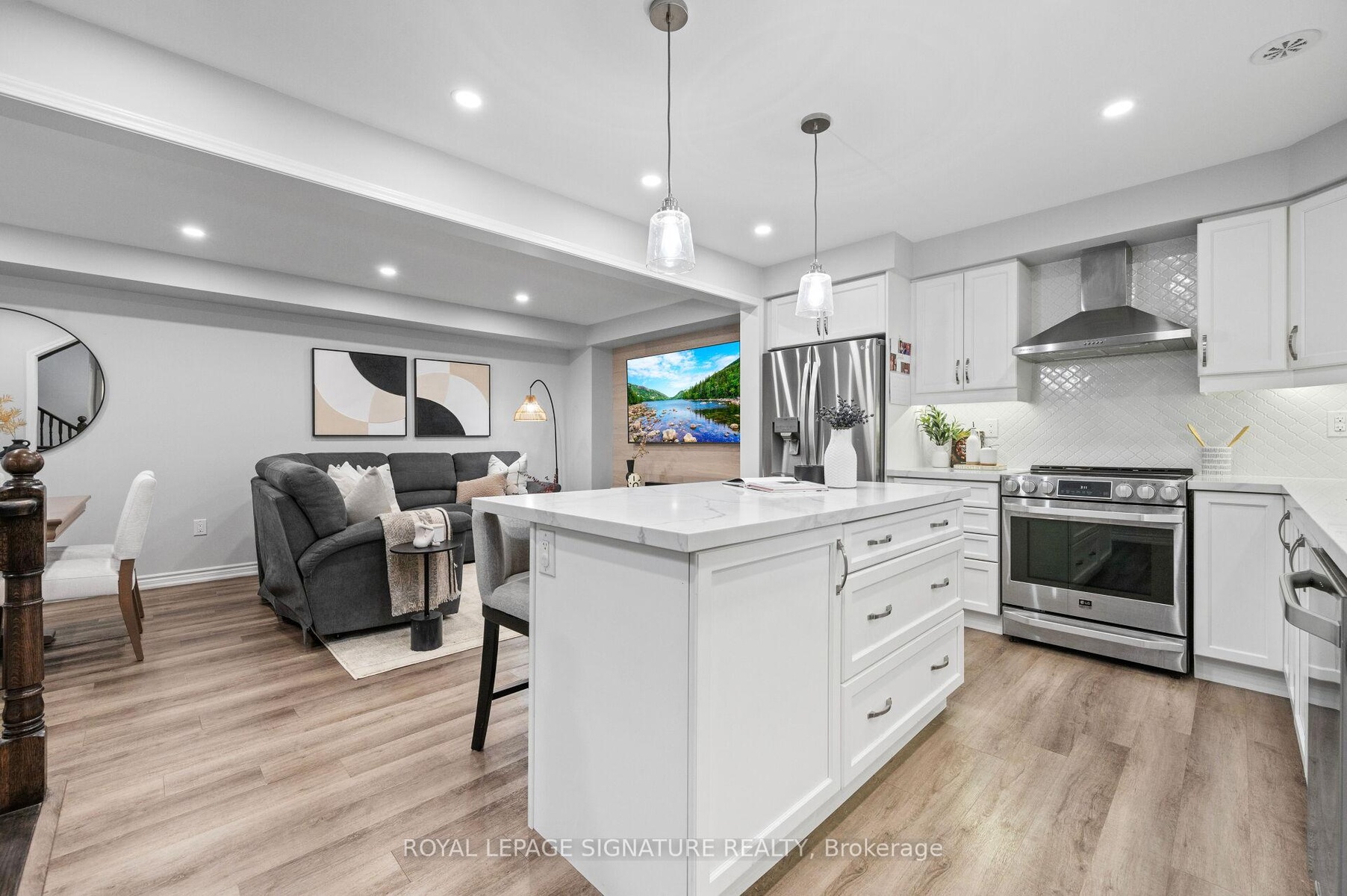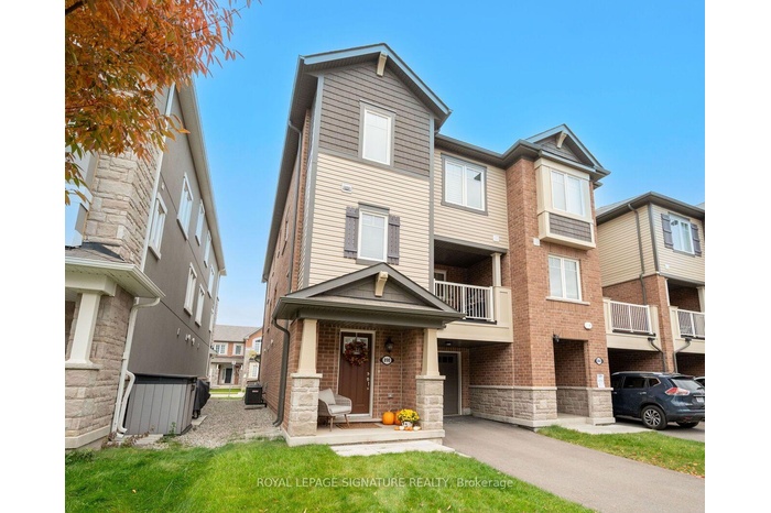 Beautiful End Unit Townhome in Sought-After Milton! This bright and modern home offers an open-concept main floor with new vinyl floors and pot lights throughout. The upgraded kitchen features a large Centre island, quartz countertops, ceramic backsplash, stainless steel appliances, and a breakfast bar. The spacious living and dining areas provide plenty of room for relaxing and family gatherings, with a walk-out to a large covered terrace complete with a natural gas line for BBQs. A conveniently located laundry room with a laundry tub and custom cabinets offers extra storage for everyday essentials. The Primary Bedroom includes a walk-in closet and a private 3-piece ensuite. Additional bedrooms are generous in size with vinyl floors, large closets, and oversized windows that fill the rooms with natural light. The welcoming foyer features ceramic flooring, inside garage access, and extra storage space. Enjoy a 1-car garage plus parking for 2 more vehicles on the private driveway with no sidewalk. Located just minutes from highly rated schools, community centers, parks, trails, GO Station, hospital, shopping, and all the amenities families love. Move-in ready - a wonderful place to call home!