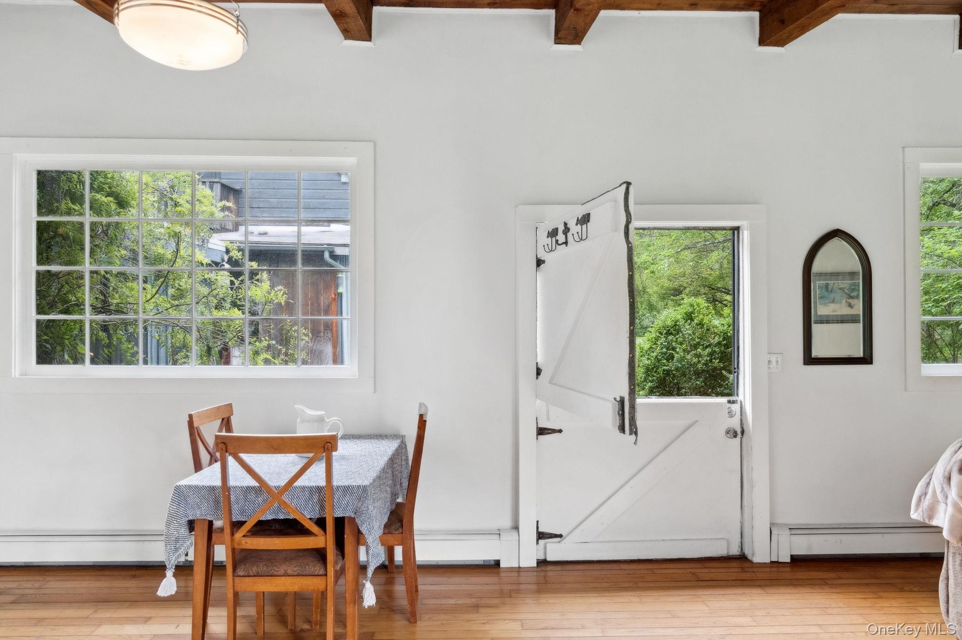 The Bearsville Cottage. A charming blend of vintage soul and creative flair, this one-bedroom cottage is perfect as a guest house, rental unit, or home office. Exposed wood beams, oversized artist windows, and a cozy woodstove make the living space both inspiring and inviting. A private bedroom entrance offers added privacy for tenants or guests, while the open kitchen and living area seamlessly extends into the backyard for easy indoor-outdoor living.