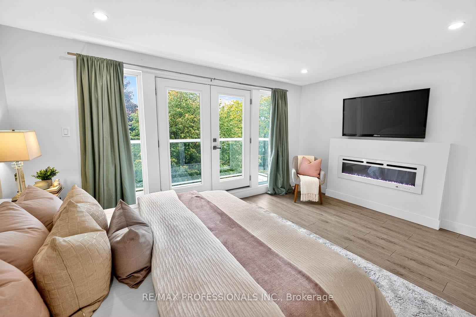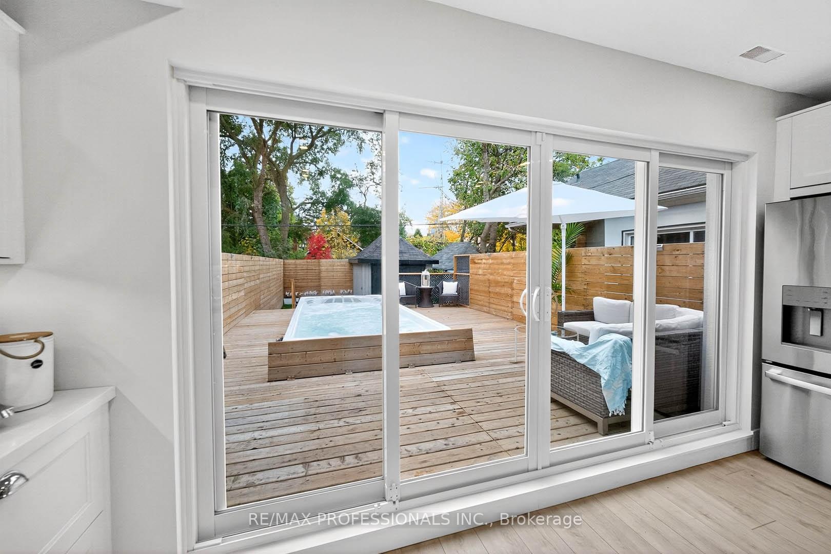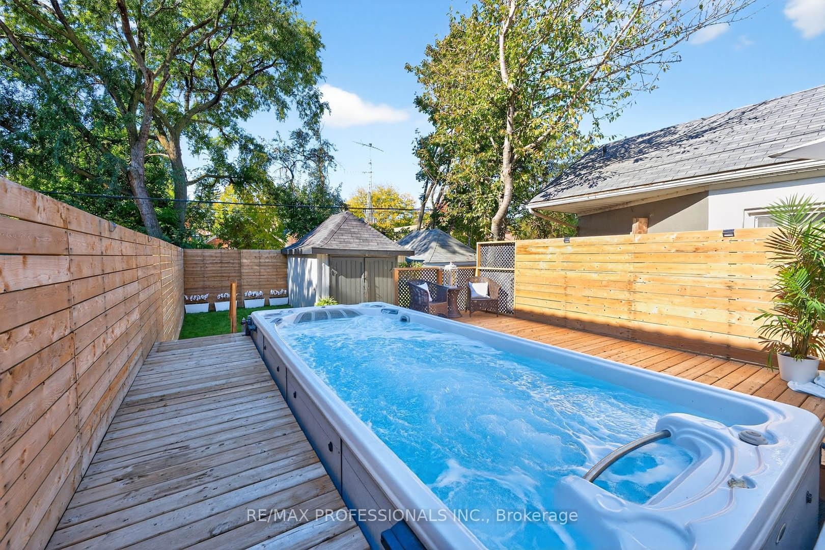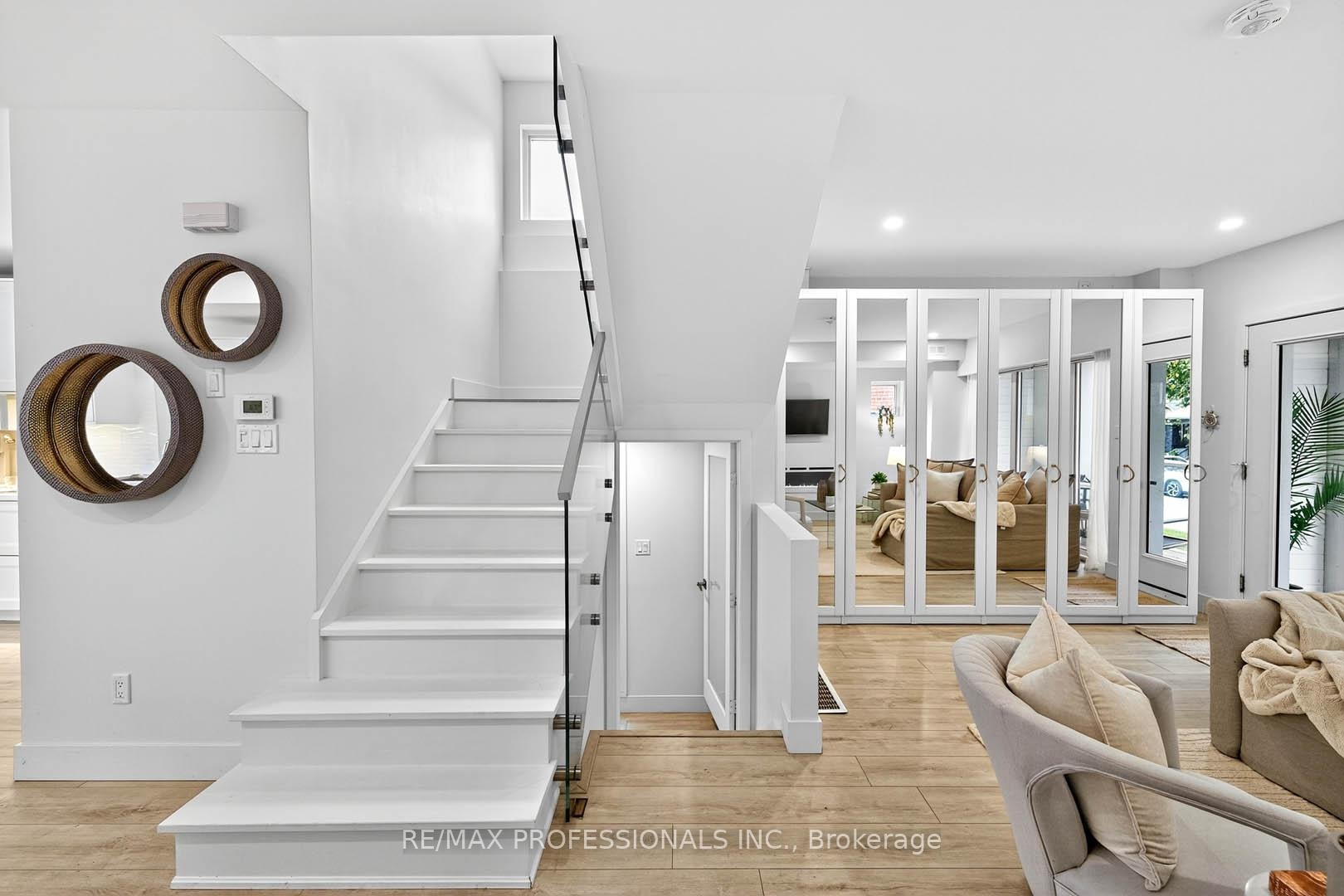 Stunning 3-Story California-Inspired Home, Completely Rebuilt in 2023! This one-of-a-kind residence in New Toronto's Lake-Side community offers 3 spacious bedrooms, 4 beautifully designed bathrooms, and a perfect blend of modern luxury and warm charm. The open-concept main floor features a sun-filled living space and a chef's dream kitchen with a large family island, premium stainless-steel appliances, integrated built-in dishwasher, countertop stove with commercial-grade hood vent, and built-in wall oven & microwave. Elegant undermount and glass cabinet lighting, along with ample storage, make this kitchen an entertainer's delight! Step outside to a large back deck and garden with a built-in Hydropool Swim Spa, creating a private backyard oasis ideal for relaxation or gatherings. The 2nd level boasts two large, light-filled bedrooms with generous closets, a modern 4-piece bath, and convenient laundry. Retreat to the entire third level, exclusively designed as a private Primary Suite featuring a sun-drenched bedroom with an electric fireplace, balcony overlooking the treed neighborhood, and a luxurious 5-piece spa ensuite with a soaker tub, crystal chandelier, double sinks with light-up anti-fog mirrors, and a separate shower with elegant glass Tiffany tile. Enjoy instant privacy with a custom remote blind! Glass & steel railings throughout add a sleek, contemporary touch. The finished basement offers a separate entrance, kitchen area with rough-in for a stovetop, spacious recreation room, 3-piece bath, fourth bedroom, and rough-in for additional laundry-perfect for guests or in-law/rental suite potential! Complete with a garage for storage, steps to beautiful parks, trails, schools, shopping, transit (TTC & GO), and so much more, this fully rebuilt home is truly turnkey and ready for you to move right in and start living your life by the lake!