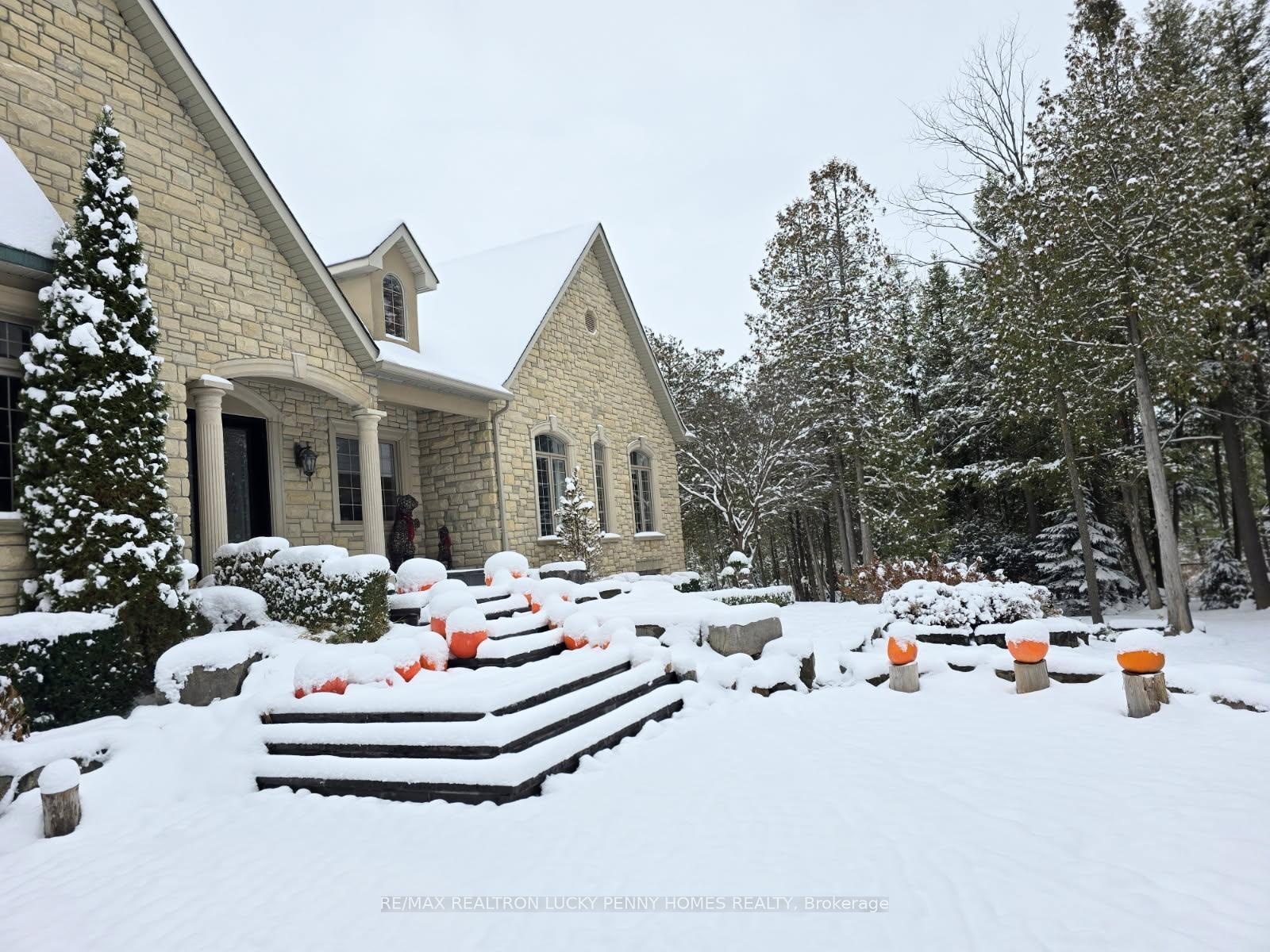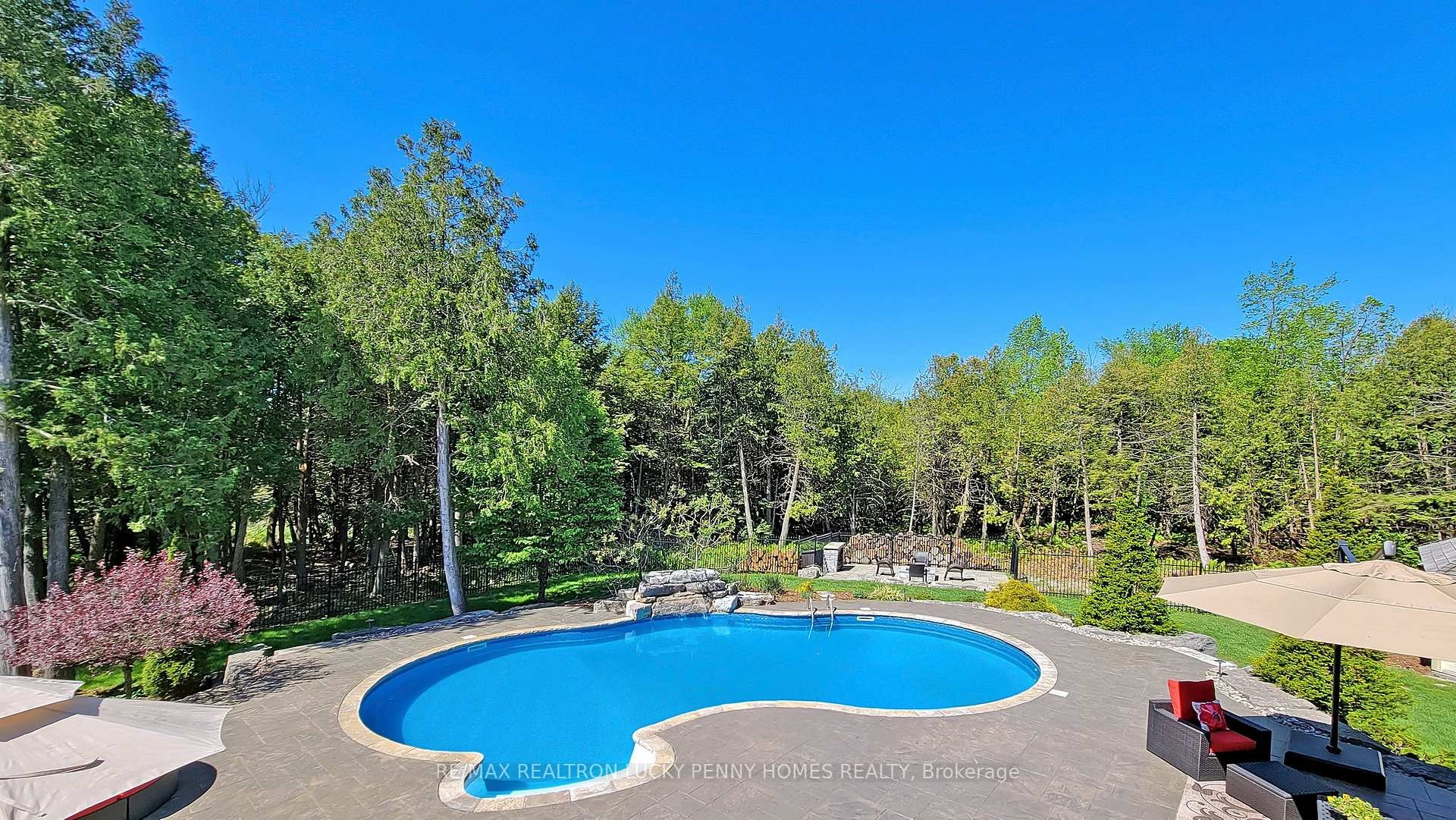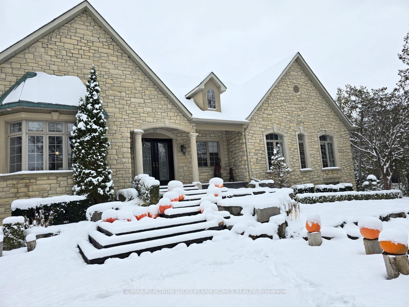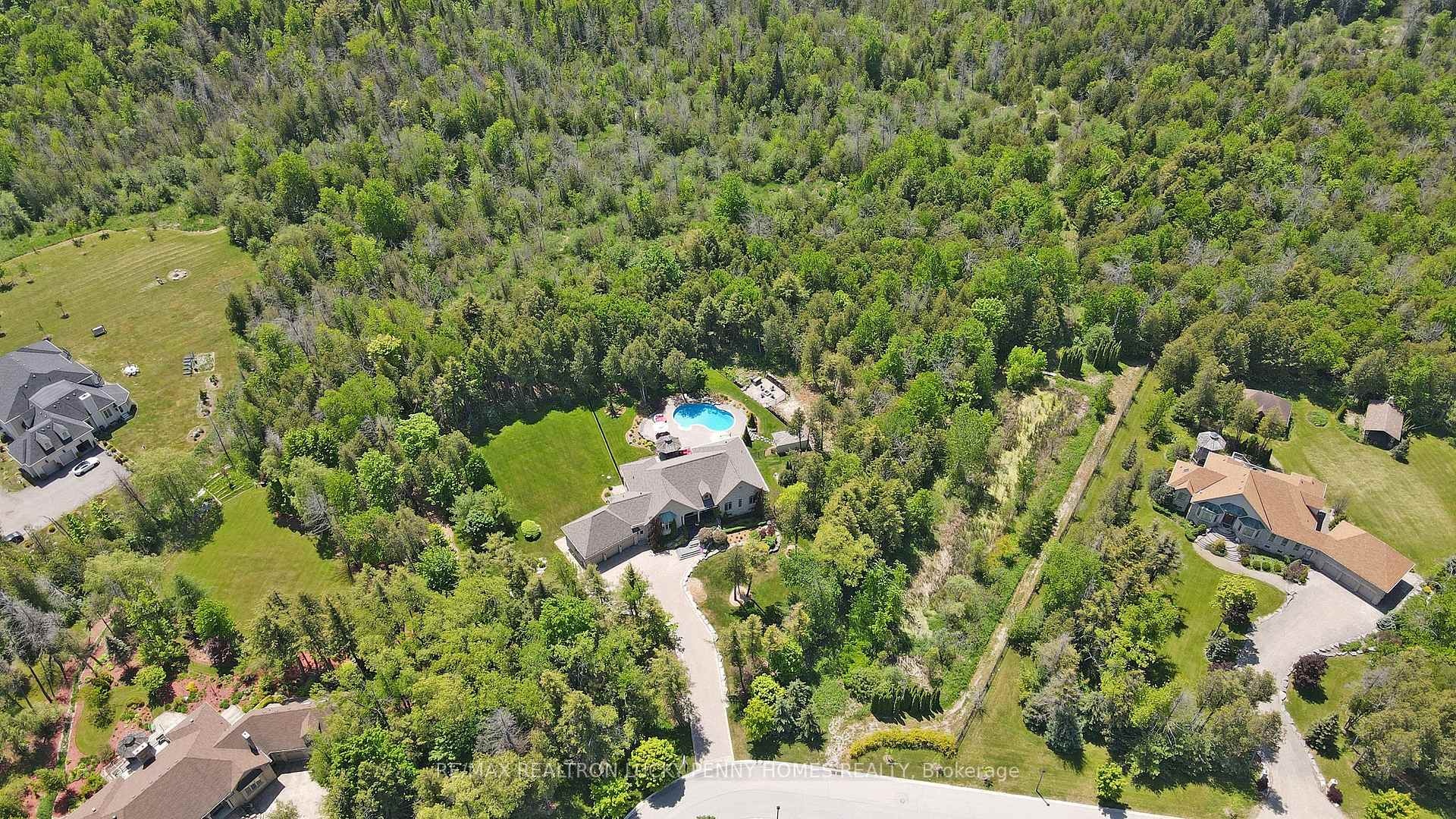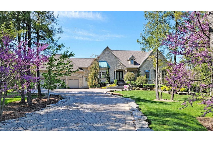 The Ultimate Entertainer's Dream Home! This one-of-a-kind luxury bungalow offers approximately 3,200 sq ft per level of refined living space on a 2-acre private treed lot in a quiet cul-de-sac, backing onto a serene 20-acre parcel with a km walking trail loop.Step inside to discover a bright, open-concept main floor with 10-foot ceilings, elegant crown moulding, and hardwood and tile floors throughout. The family room features a gas fireplace, built-in shelving, and walkout to the deck, seamlessly connecting to a gourmet kitchen with stainless steel appliances, centre island, and tile flooring. Adjacent breakfast area also walks out to the deck, overlooking the resort-style backyard. The formal dining room offers a gas fireplace and bay window, perfect for gatherings.The primary bedroom suite includes a gas fireplace, walk-in closet, and walkout to the deck, while two additional main-floor bedrooms share a semi-ensuite and feature hardwood floors and large windows. A private office with crown moulding and large window provides a perfect workspace.The professionally finished walkout basement boasts heated floors, 10-foot ceilings, and a spacious Great Room with wet bar, gas fireplace, and walkout to the patio. Additional features include two more bedrooms, an exercise room, and ample storage space-ideal for guests or multi-generational living. Step outside to your backyard oasis featuring an in-ground pool, cabana, and multiple seating areas surrounded by mature trees, creating the ultimate resort experience. The backyard also includes a treehouse and a dog free run fenced area, offering both adventure and freedom for family and pets alike.
