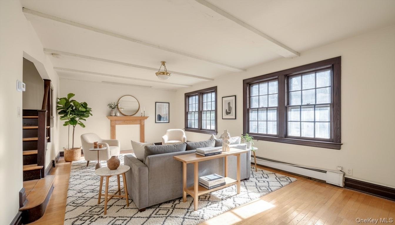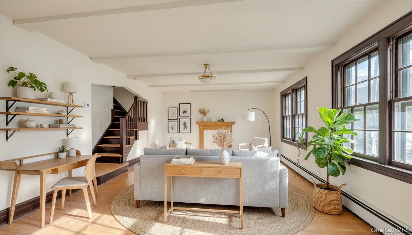 - living room with a baseboard heating unit, light wood-style flooring, and beam ceiling