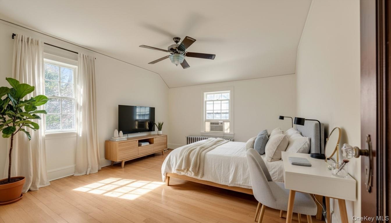 - Bedroom #1 Primary Bedroom, wood flooring, a ceiling fan