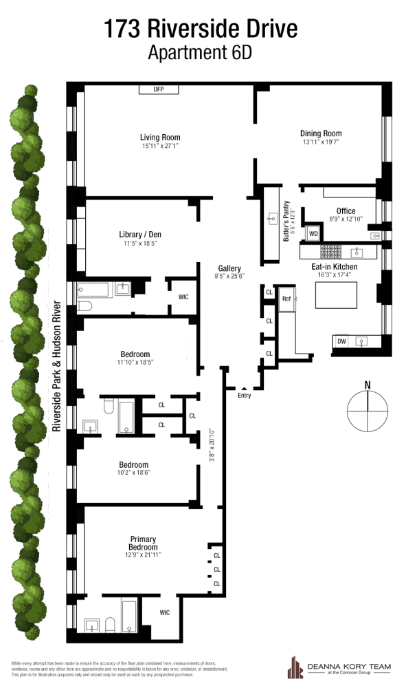 Enjoy stunning Riverside Park and Hudson River views from five rooms of this elegant nine-room home. Expansive windows fill the apartment with bright, airy light that shifts beautifully with the seasons. Eleven windows overlook Riverside Park and the iconic Soldiers' and Sailors' Monument, capturing glowing sunsets over the river to the west and abundant morning light from the open eastern exposures. Apartment 6D is one of the most sought-after layouts in the building - a grand classic nine reimagined into eight rooms spanning approximately 3,000 square feet. A sweeping central foyer leads to an ideal floor plan with four bedrooms (currently configured as three plus a library) and three full baths. The large living room and bedrooms face west toward the river, while the formal dining room, office, and oversized kitchen face east. The layout offers a wonderful balance of formal entertaining areas and private living spaces.