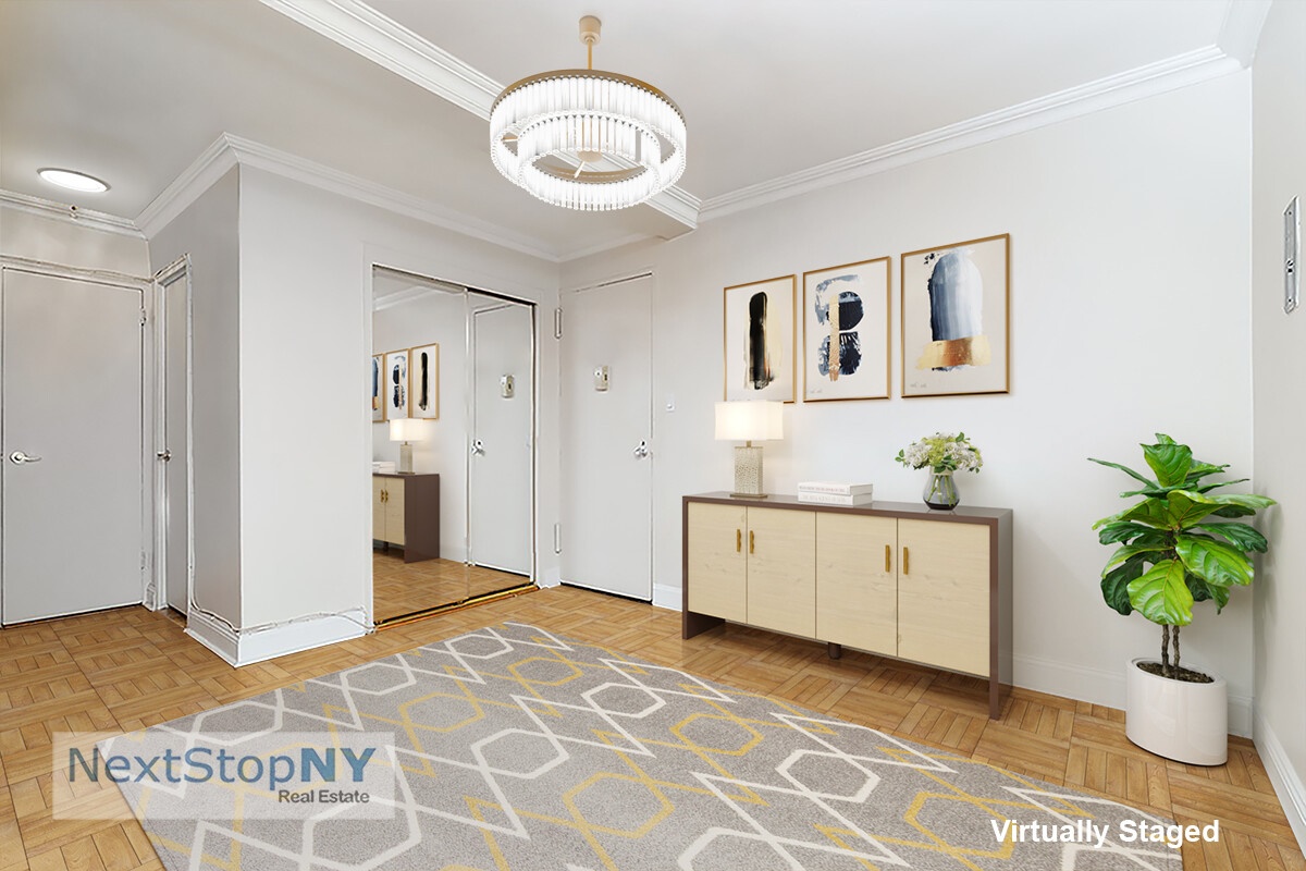 This spacious, sun-drenched home features a gracious entry foyer that opens into an expansive living room, perfect for both entertaining and relaxing. With south-facing city views, the home is bathed in natural light throughout the day. Your large furniture and layout needs are all welcome here with ample space for living, dining and even home office areas, this living space will not disappoint! Wall-to-wall custom radiator covers with built-in storage add both function and design.