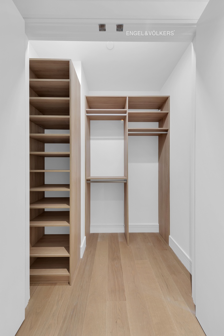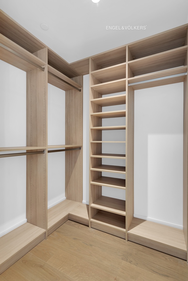 The serene primary suite enjoys eastern exposure and features two large custom closets along with a luxurious five-fixture bath clad in Calacatta Vagli marble. The bathroom includes radiant heated floors, a soaking tub, an enclosed shower, a custom Sycamore wood vanity, and a honed marble countertop.