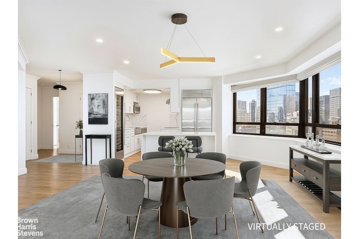 Enjoy a light-filled, open-plan living and dining room with a renovated kitchen featuring quartzite countertops, a waterfall island, white lacquered cabinetry, a Sub-Zero refrigerator, 130-bottle wine storage, a Wolf stove, Miele dishwasher, and custom fixtures. This is the perfect place for morning coffee, overlooking the Chrysler Building and Manhattan skyline.