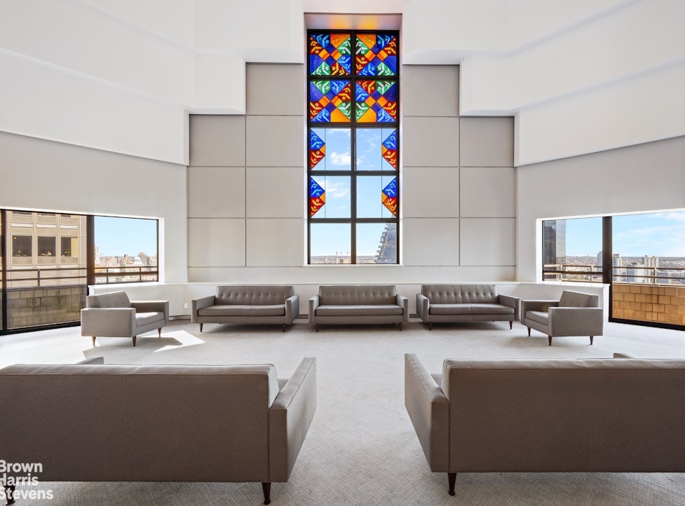 It offers amenities such as landscaped public and private gardens, a 43rd-floor swimming pool, a health club, a roof deck, a two-story residents' lounge with a catering kitchen for events, a children's playroom, cold storage, on-site laundry, and parking. Pets and subletting are permitted.
