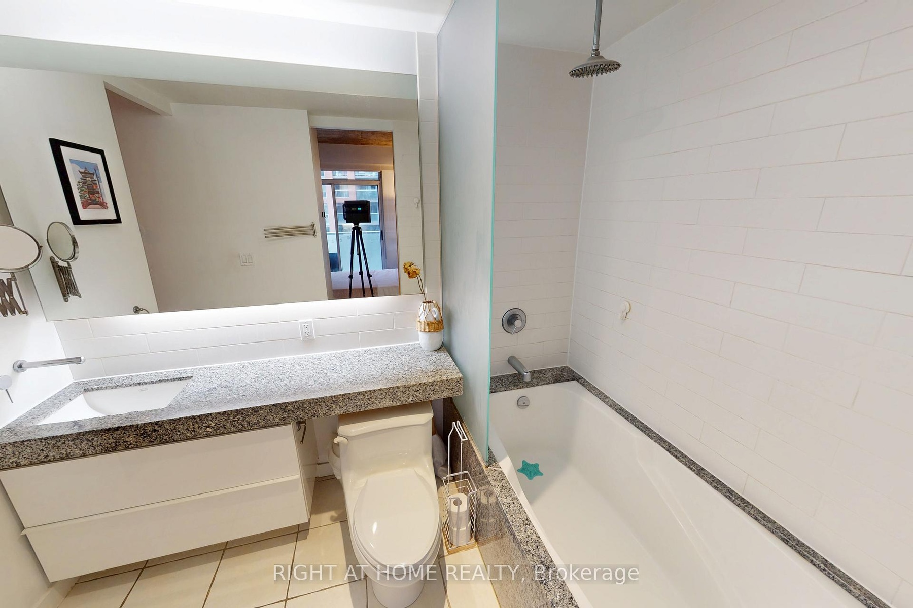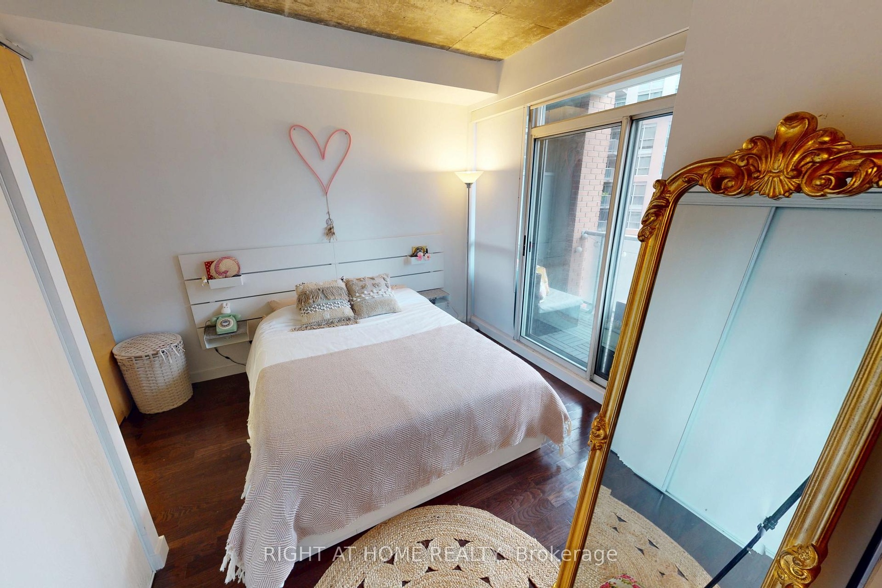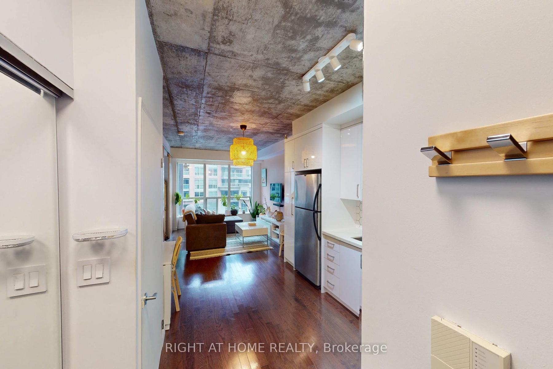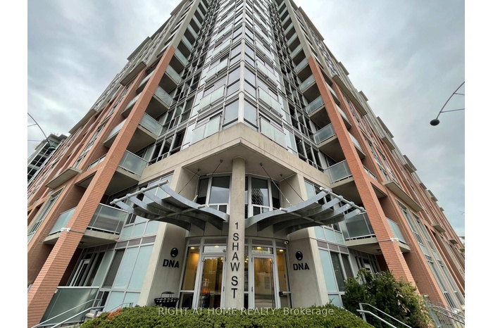 Welcome to your home at DNA Condos, where modern design meets unbeatable convenience in the heart of King West! This stylish 1-bedroom condo features soaring 9 ft exposed concrete ceilings, hardwood floors throughout, and a bright, open-concept layout perfect for everyday living and entertaining. The sleek modern kitchen is a chef's dream with stainless steel appliances, a gas stove, granite countertops and tall cupboards. Step out from your primary bedroom with a semi-ensuite 4-piece bath, onto the private balcony, complete with a gas BBQ hookup - a rare city luxury! The suite also include ensuite laundry, 1 parking space, 1 locker, and all light fixtures and window coverings. DNA Condos is one of Toronto's most sought-after addresses, offering a chic lobby, fitness facilities, a 24-hour concierge, a rooftop terrace with BBQs, and a stylish party room. Here, you're not just buying a home - you're joining a vibrant community. Live just steps from Liberty Village, King West, and some of Toronto's best dining, nightlife, and shopping. Transit is effortless with the TTC right at your door, and plenty of green spaces like Massey Harris Park, Stanley Off-Leash Dog Park, and Liberty Village Dog Park are nearby for a breath of fresh air. If you're looking for the perfect downtown pad, this condo checks all the boxes!