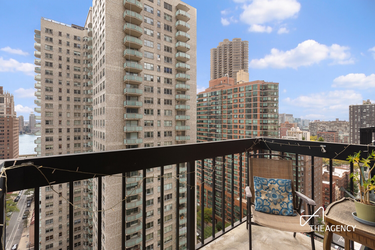 Residence 22E is a spacious one-bedroom featuring great natural light, open views, and a private balcony with city and East River views. The living area offers plenty of room for both living and dining, and the bedroom comfortably fits a king-size bed.