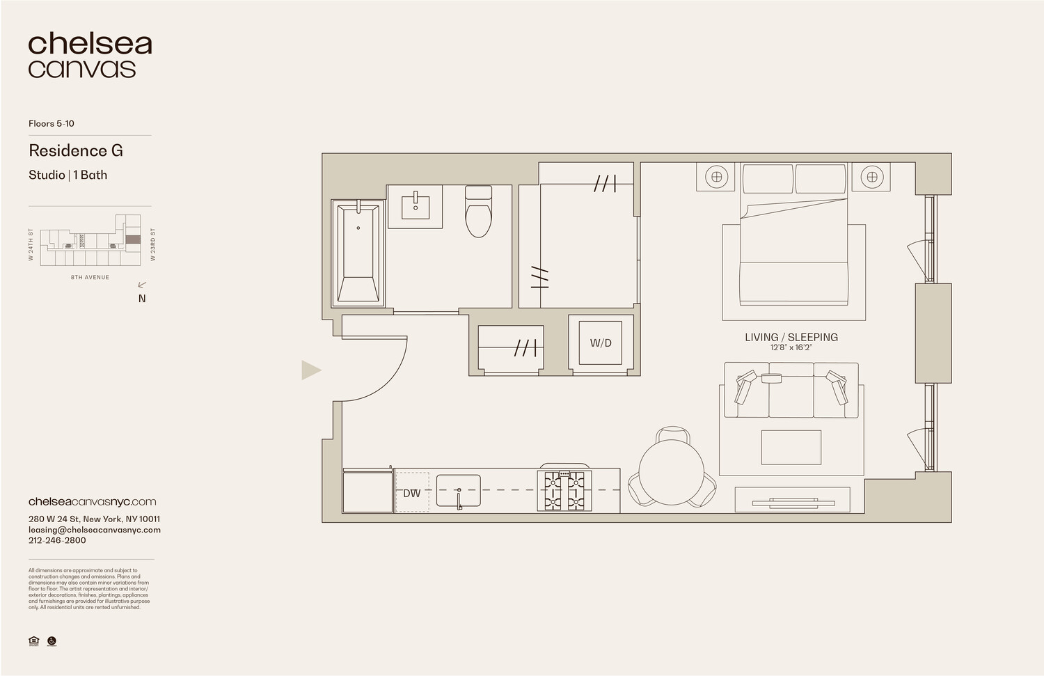 Experience the exceptional with carefully crafted amenities, including a club lounge with coworking spaces, a garden terrace, an expansive rooftop, and a fully-equipped fitness center. Located in the heart of Chelsea, Manhattan's most sought-after neighborhood, Chelsea Canvas offers endless discovery. Explore galleries, museums, and dining destinations. Wander the West Side and beyond with easy access to the A,C,E and 1,2,3 subway stations, The High Line, and Moynihan Train Hall.
