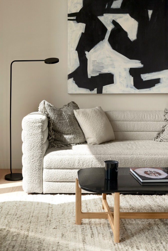 Thoughtful kitchens are adorned with Caesarstone countertops and backsplashes, white oak cabinets, and Bosch appliances. Spa-inspired bathrooms feature oversized Italian-inspired stone-style tiles and oak vanities with white Caesarstone sink tops.