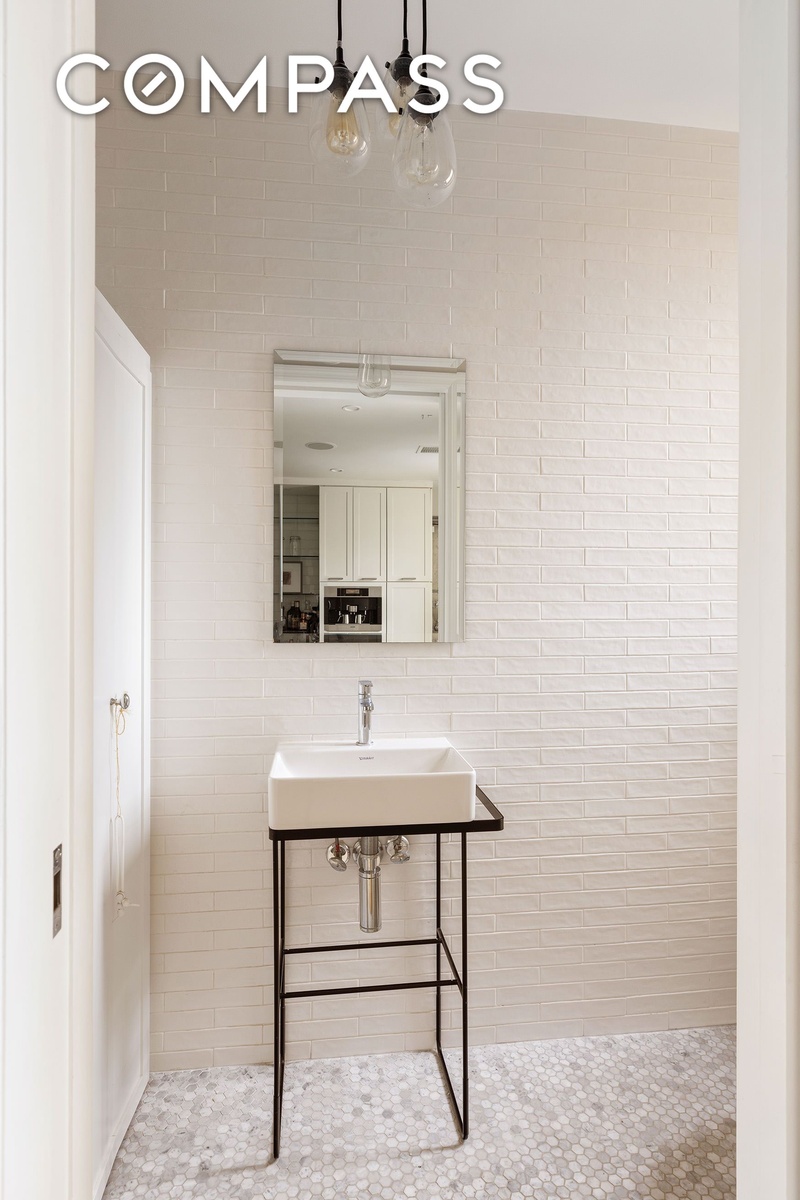 Additional highlights include a built-in home office workstation just off the kitchen, a stylish powder room, an in-unit Miele washer and dryer, beautifully laid chevron-patterned hardwood floors, custom recessed lighting, central air conditioning in the main living areas, and detailed crown and baseboard moldings throughout.