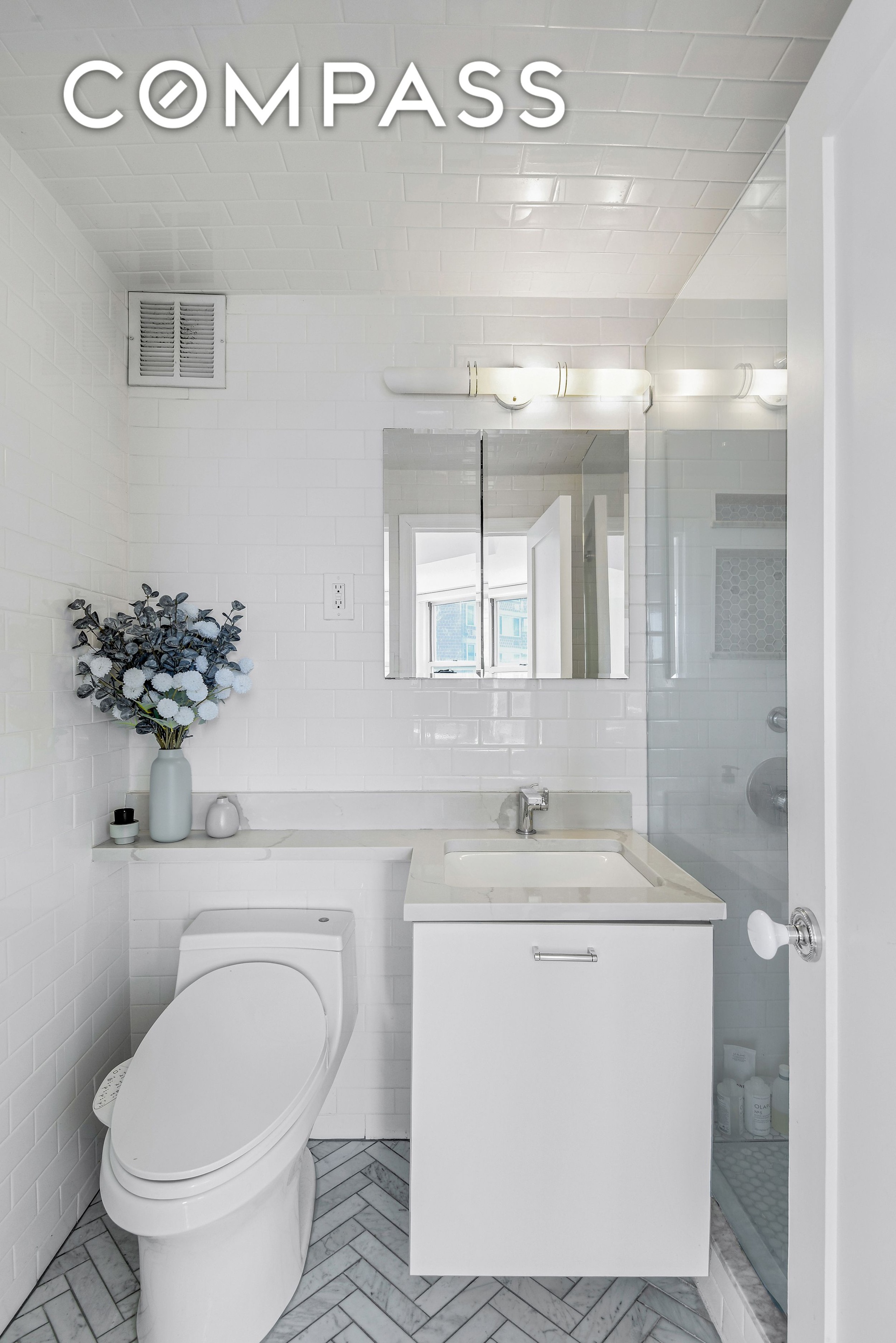 The spa-like bathroom is a serene retreat featuring white subway tiles, a sophisticated Kohler toilet with a washlet, a Kohler sink and vanity, and American Standard fixtures. The floor adds a touch of class with stunning Carrara marble. Abundant vanity and medicine cabinet storage as well as a third oversized custom California closet located next to your bathroom.