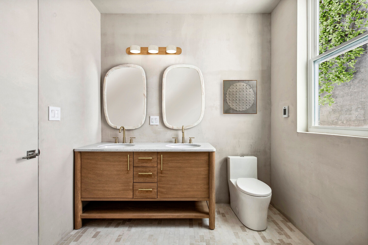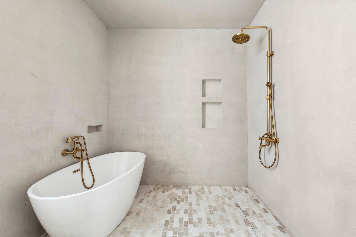 Upstairs, the primary suite is a private refuge. A southern exposure floods the room with natural light. Large windows open to a private balcony overlooking the garden. A true walk-in closet provides ample storage, while the ensuite spa-like bathroom boasts heated floors, plastered walls, a double vanity, and a luxurious wet room featuring a deep soaking tub and shower.