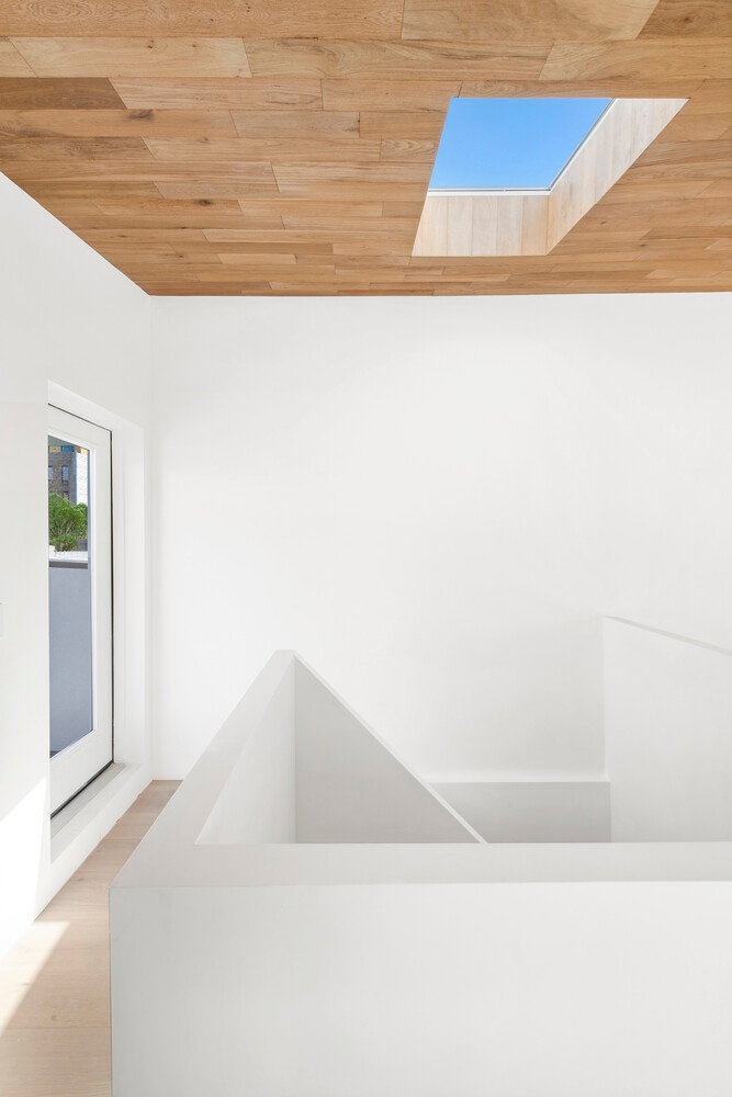 The third floor unveils an extra-large bedroom designed to inspire. Floor-to-ceiling windows frame the sky and surrounding vista. Above, a skylight bathes the room in soft, natural light, complementing the white oak ceiling, which echoes the refined design found throughout the home.