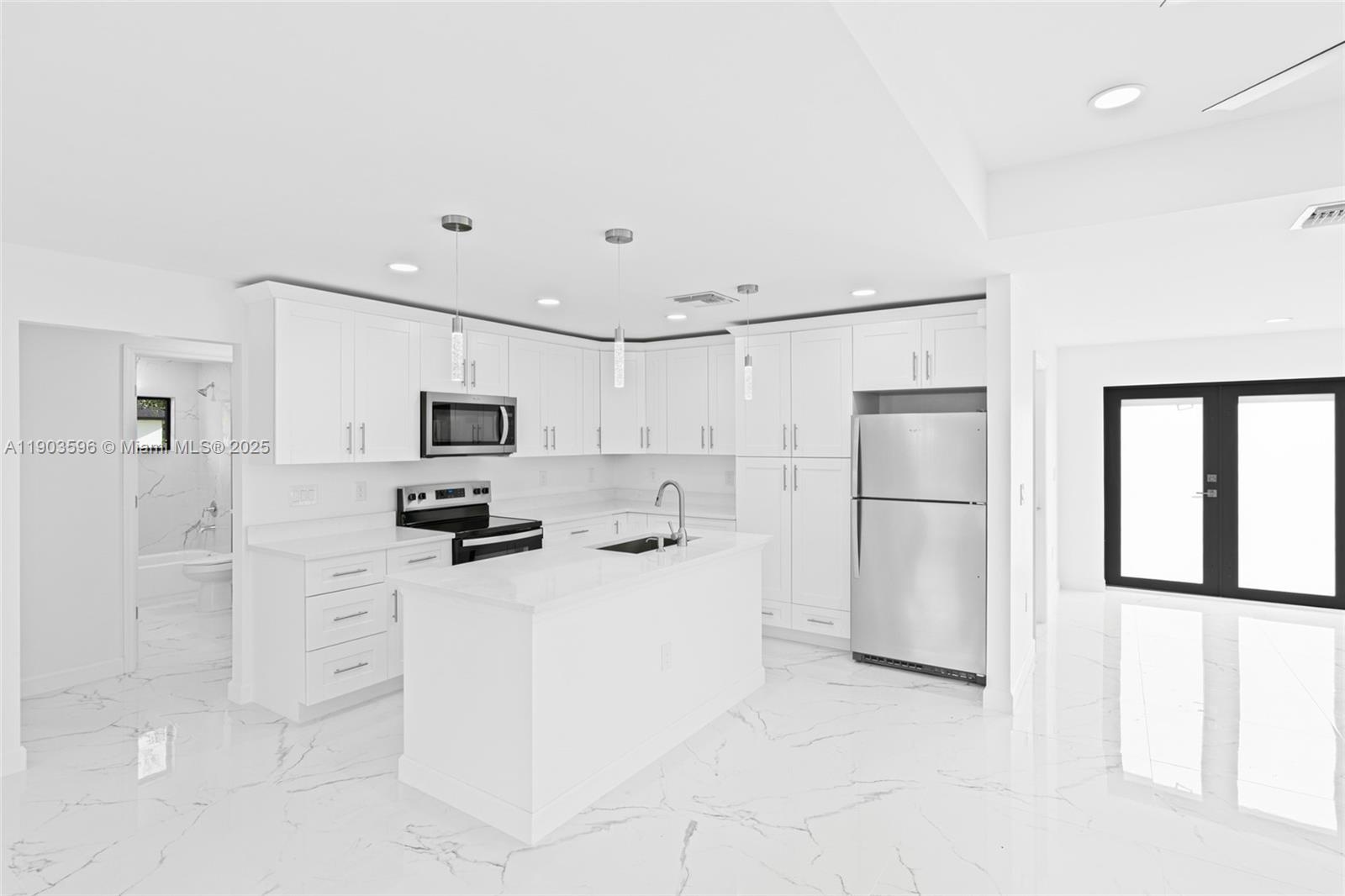 Stunning 3 bedroom, 2 bath lakeview home featuring an open concept layout with white porcelain floors and plenty of natural light.