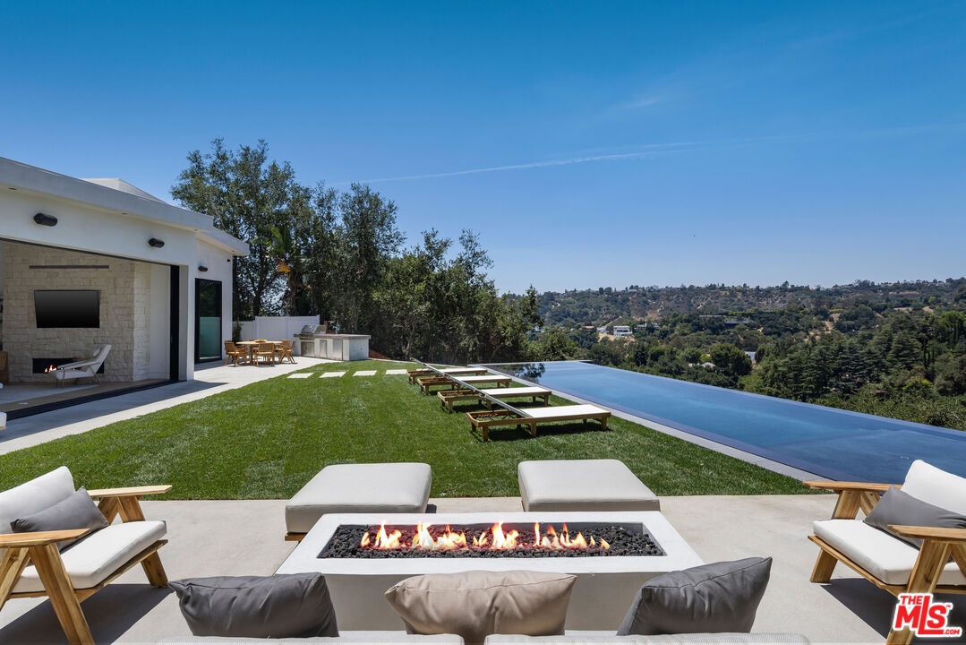 Tucked away on a quiet cul-de-sac in the prestigious Beverly Hills Post Office area, this newly completed modern masterpiece offers breathtaking jetliner canyon views. Privately gated for maximum security and seclusion, the home showcases soaring 18-foot mahogany-clad ceilings, multiple skylights, a dramatic 16-foot-tall library, and expansive sliding glass doors for seamless indoor-outdoor living. The dramatic black-tiled pool, perched on five structural caissons, features a stylish Baja shelf - perfect for lounging in privacy while enjoying the view. Distinctive interior finishes include white oak flooring, Calacatta Cremo countertops in the kitchen, Fantasy Pink marble vanities in the guest suites, and a powder room with Calacatta Picasso marble and Roman clay walls. Custom walnut cabinetry adds warmth and sophistication throughout. The primary suite features a serene sitting area, a large custom walk-in closet, and a spa-like bath with a soaking tub overlooking the stunning views. Outdoors, enjoy a full kitchen equipped with a sink, BBQ, and refrigerator, along with a built-in fire pit perfect for entertaining. Every detail has been thoughtfully curated to elevate both design and function. With world-class finishes and exceptional craftsmanship, this home is a true expression of luxury living.
