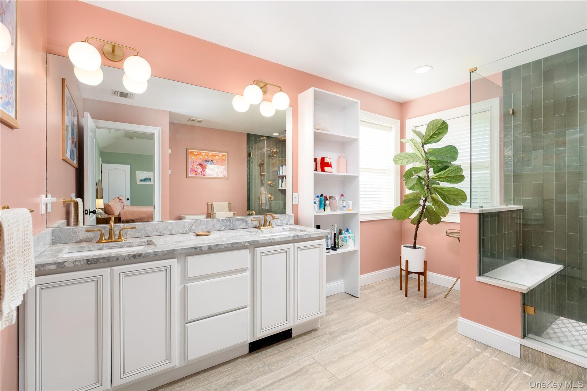 Upstairs offers a bright landing overlooking the foyer, three generously sized bedrooms with hardwood floors and ample closet space, plus a hall bath with tub/shower and tile accents. The primary suite provides a peaceful retreat with a walk-in closet and a spa-inspired bath featuring a double-sink vanity and a glass-enclosed tiled shower.