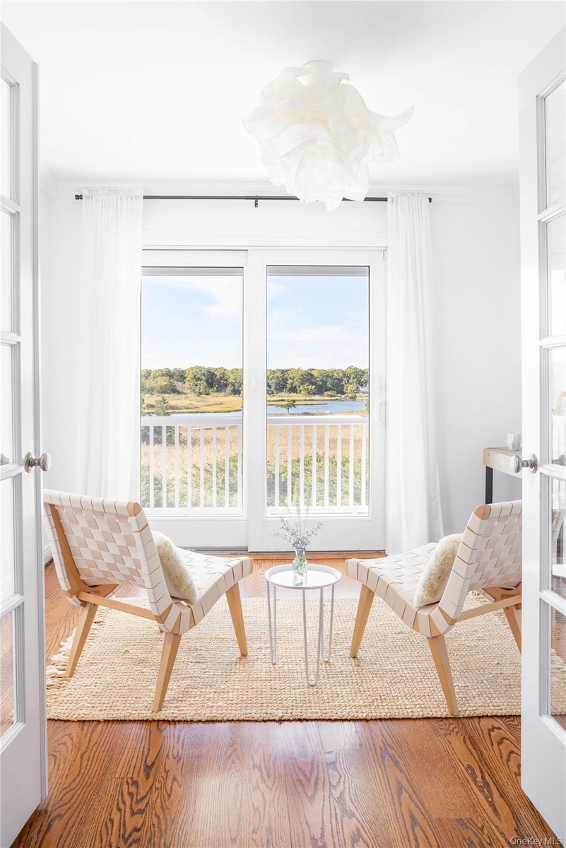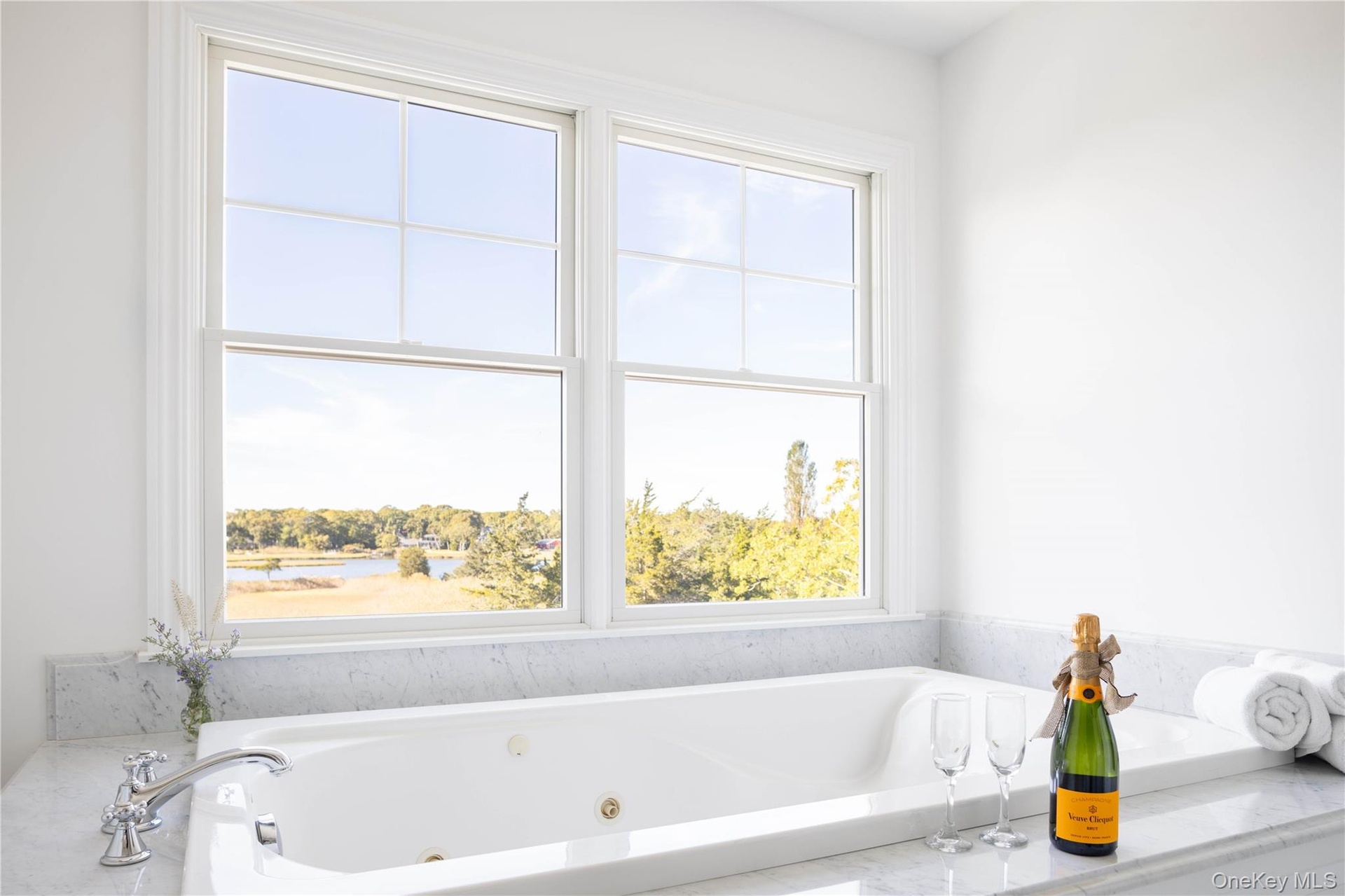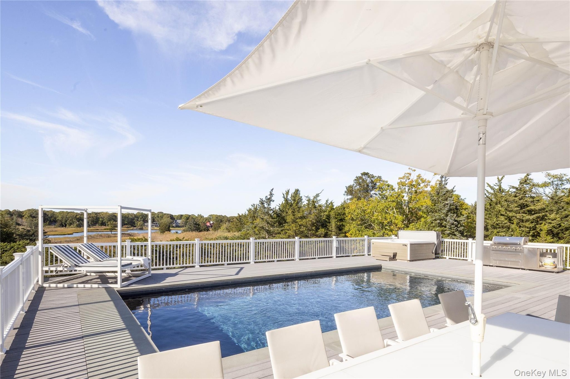 Outdoor amenities elevate the estate’s appeal, featuring a new 16 x 32 heated saltwater gunite pool with an electric cover, high end luxurious 6-person hot tub, outdoor shower, and an expansive 2,100 SF deck overlooking the water. A wide, clear path leads to a fire pit area and private dock previously docking a 23-foot Grady-White—with direct access to the bay.