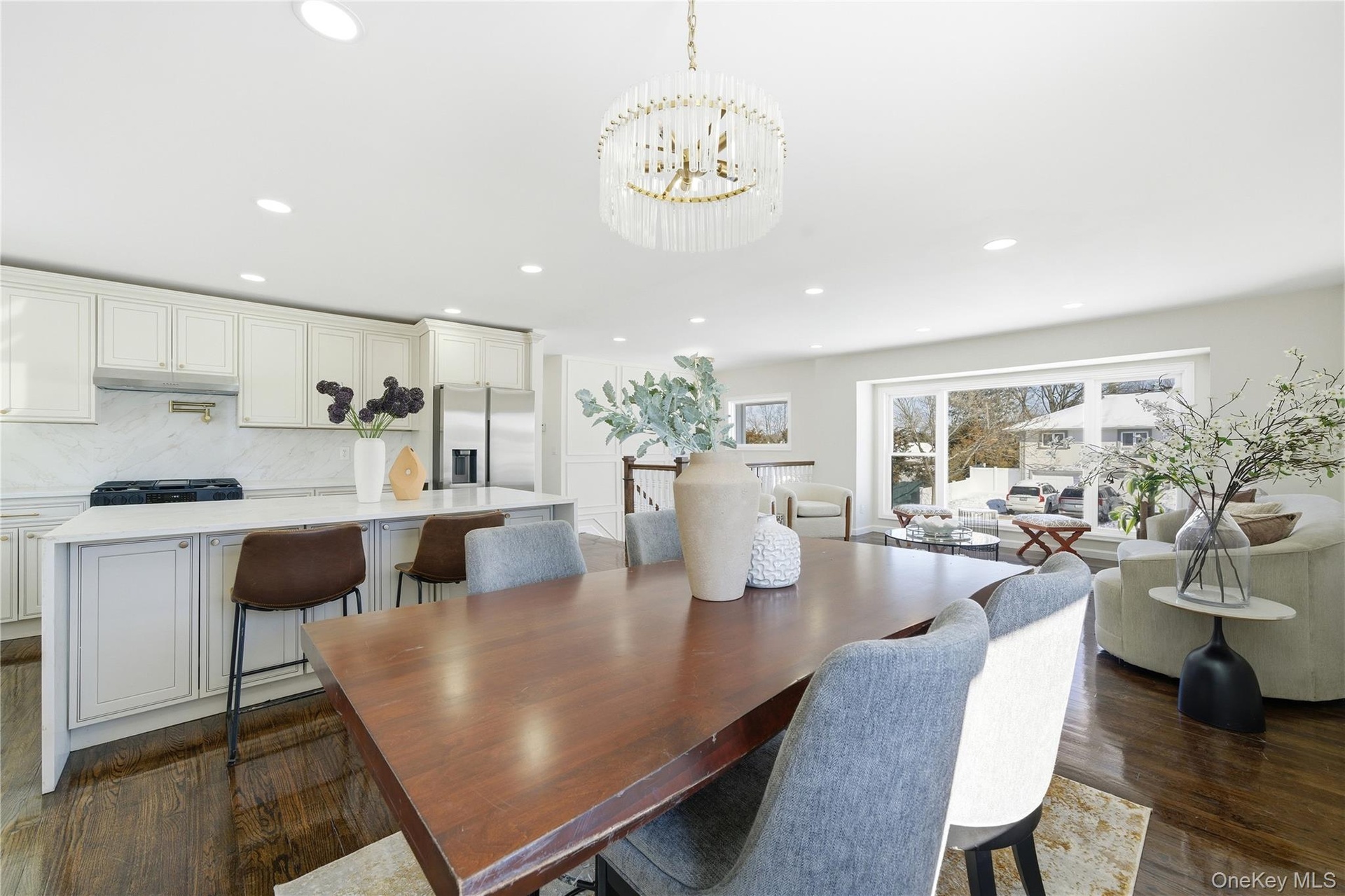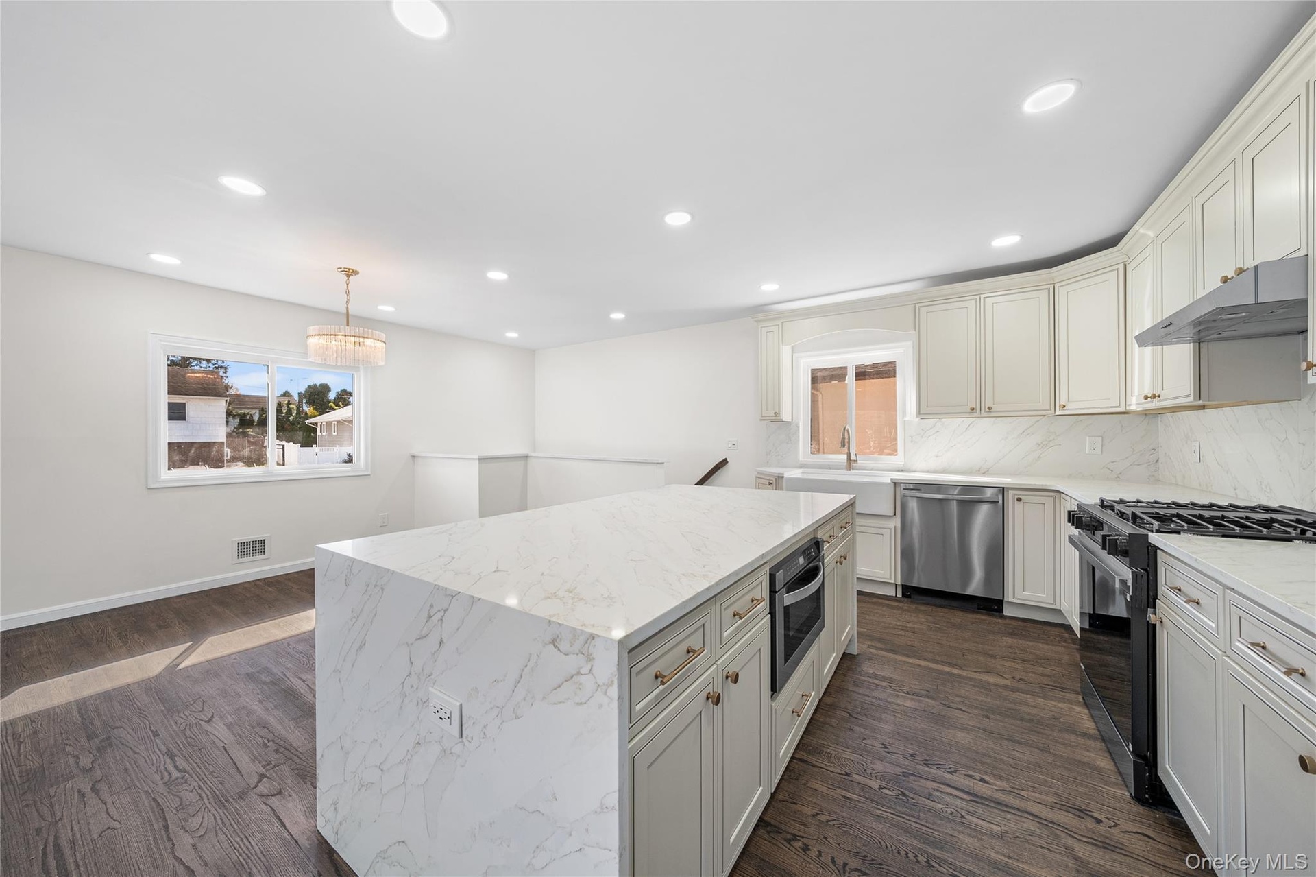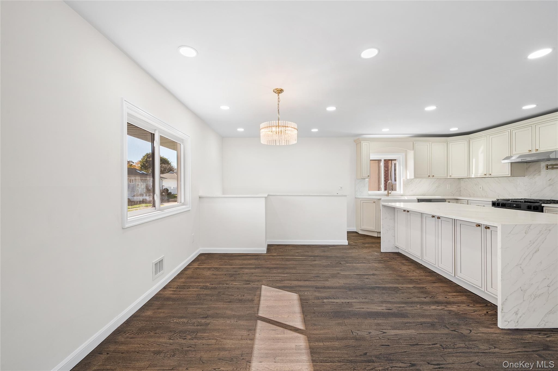 - Kitchen with pendant lighting, dark wood-type flooring, recessed lighting, backsplash, and light stone countertops