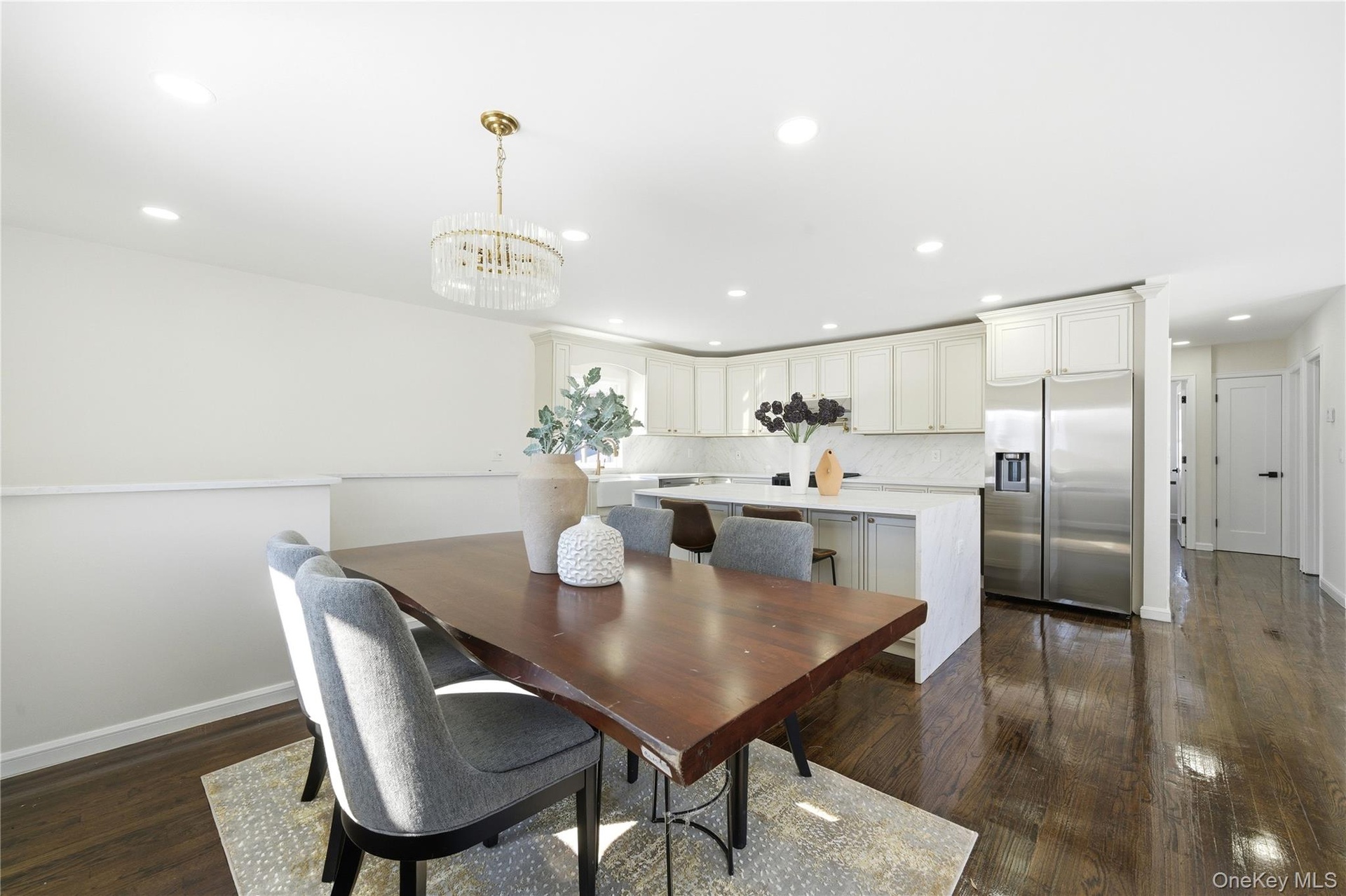 - Kitchen featuring a center island, stainless steel fridge with ice dispenser, dark wood finished floors, light stone counters, and a chandelier