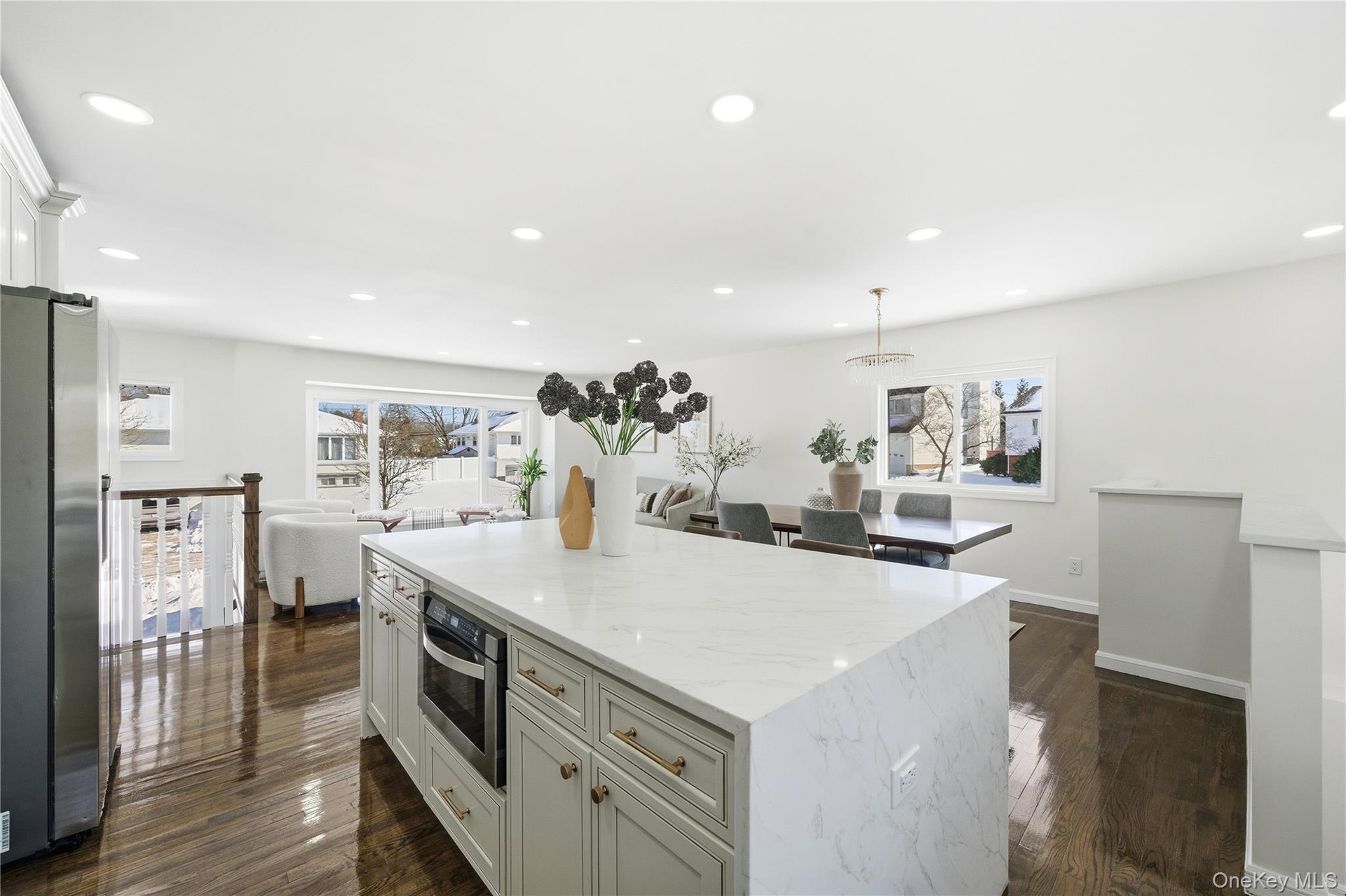 - Kitchen featuring light stone counters, a spacious island, appliances with stainless steel finishes, dark wood-style floors, and recessed lighting