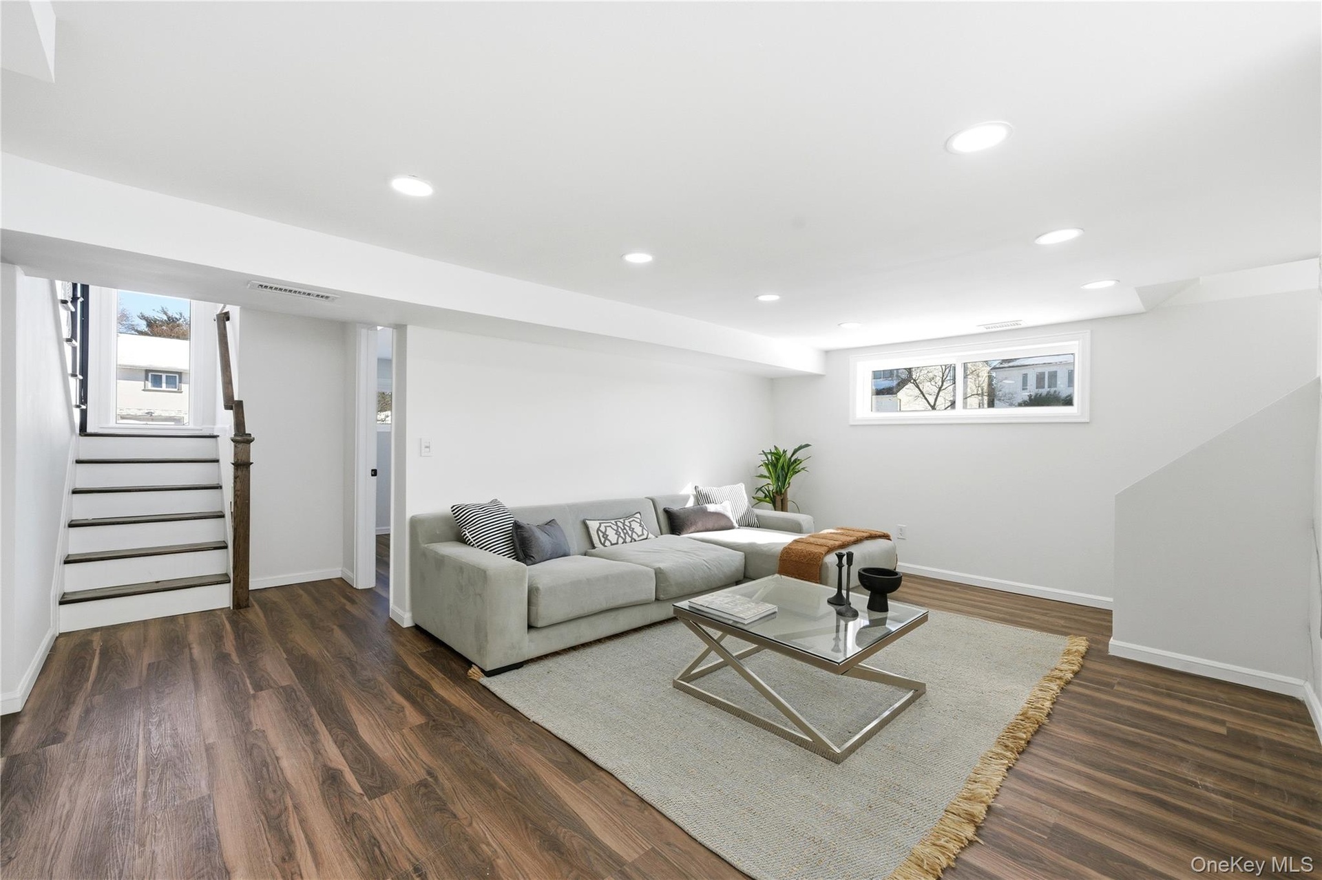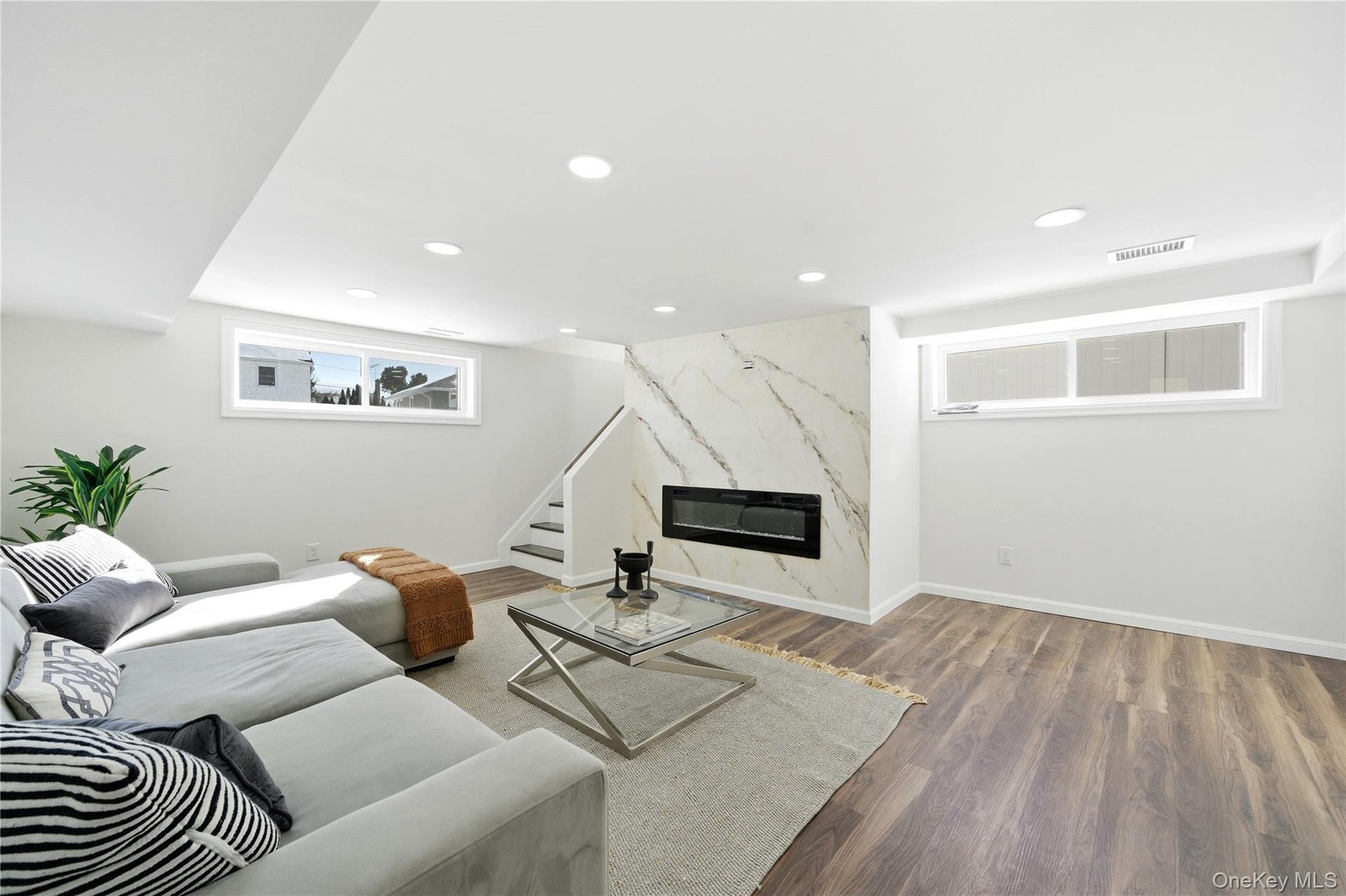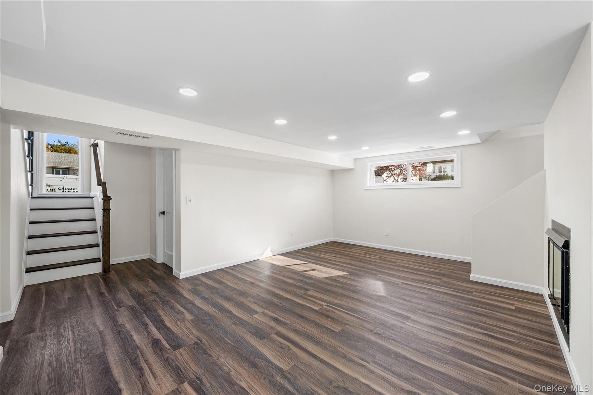 - Below grade area featuring dark wood-style flooring, a glass covered fireplace, stairs, and recessed lighting