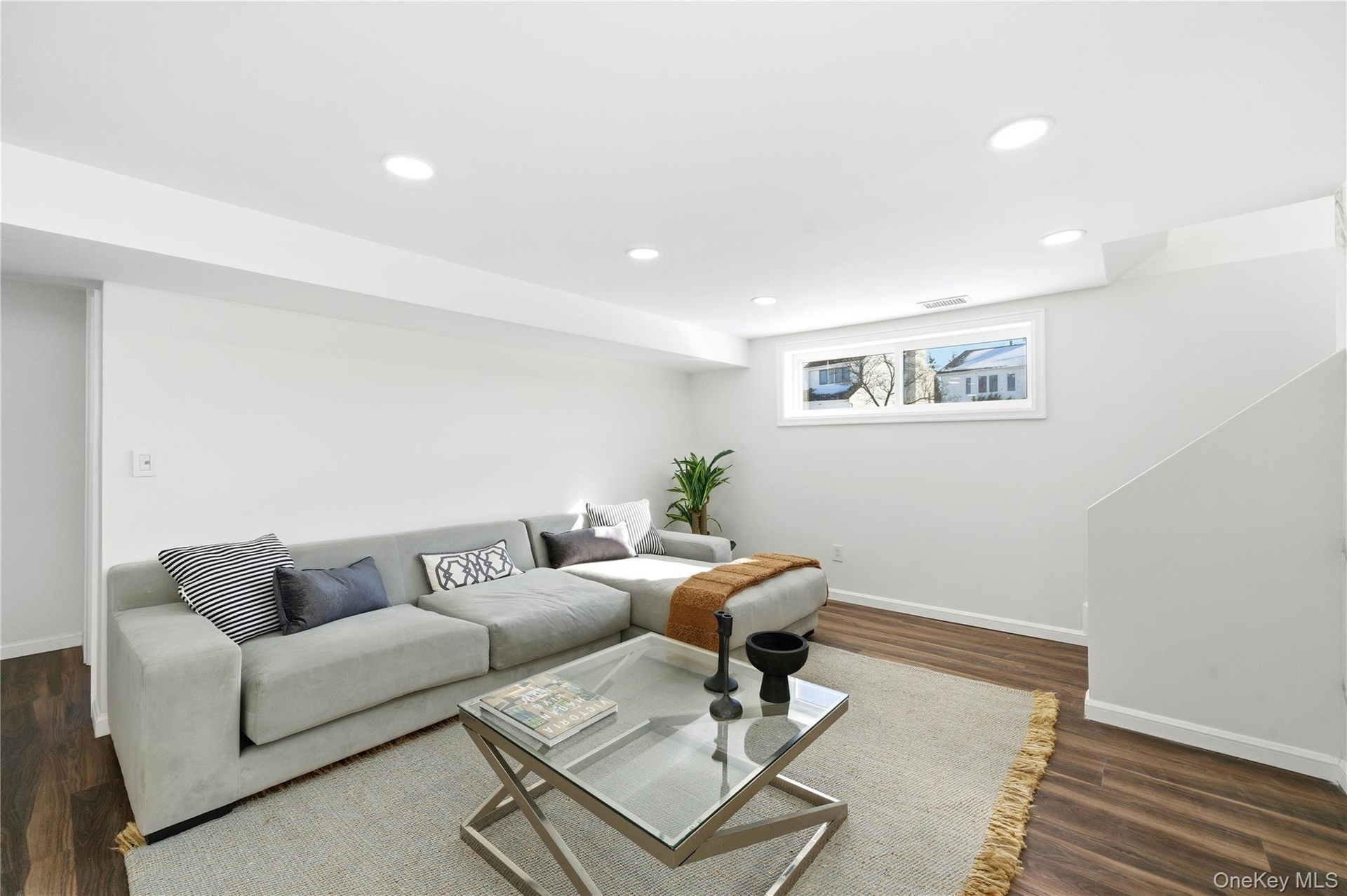 - Unfurnished living room with dark wood-style floors and recessed lighting