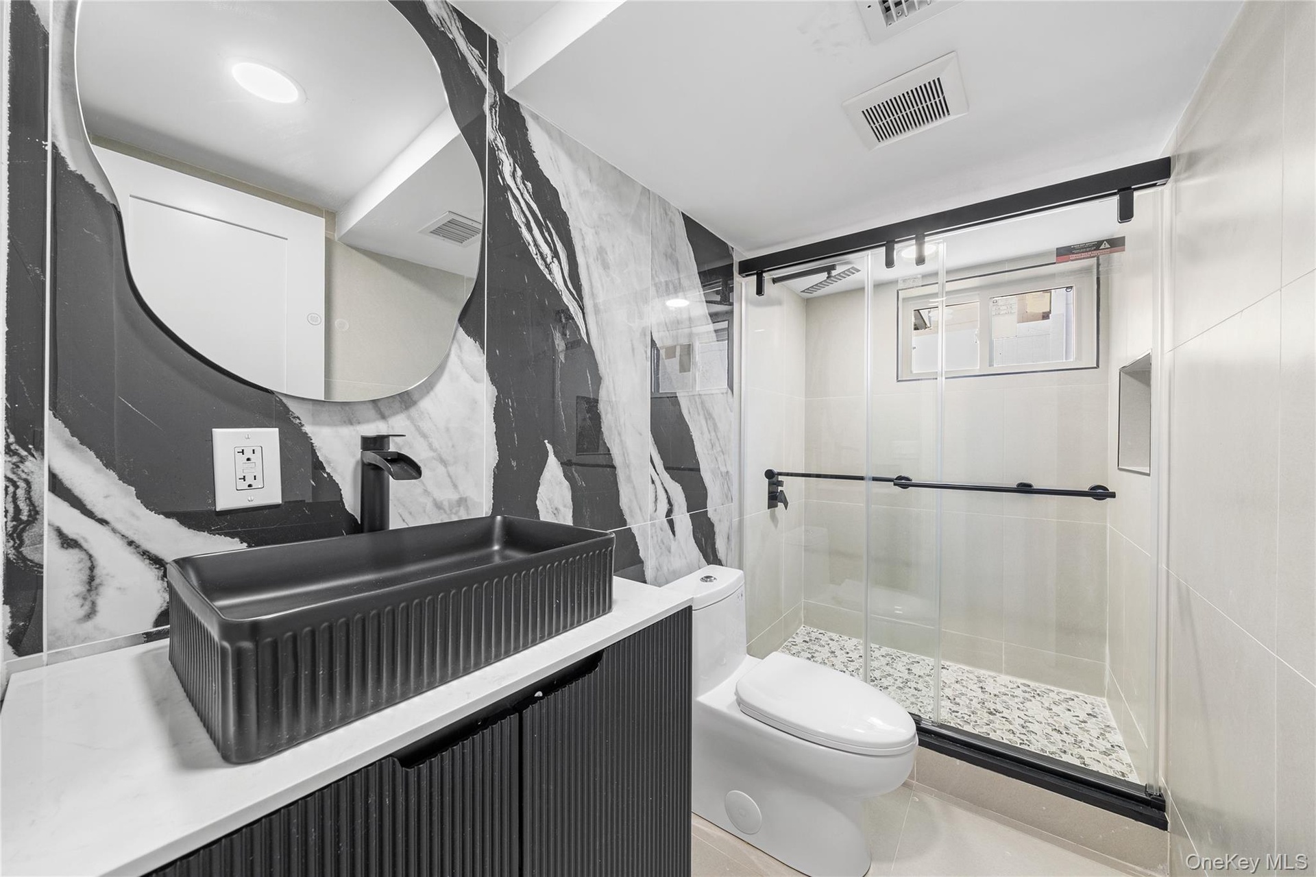 - Bathroom featuring a stall shower, vanity, and tile walls