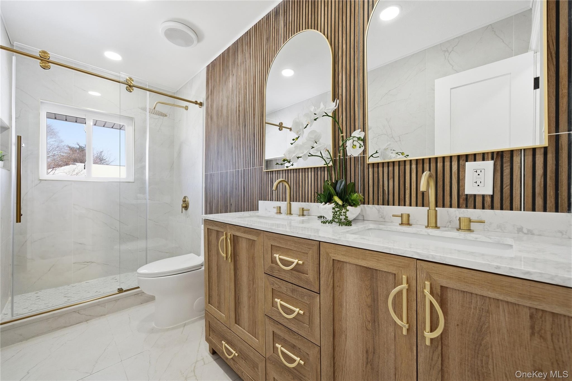 - Full bath featuring a marble finish shower, double vanity, light marble finish flooring, recessed lighting, and tile walls