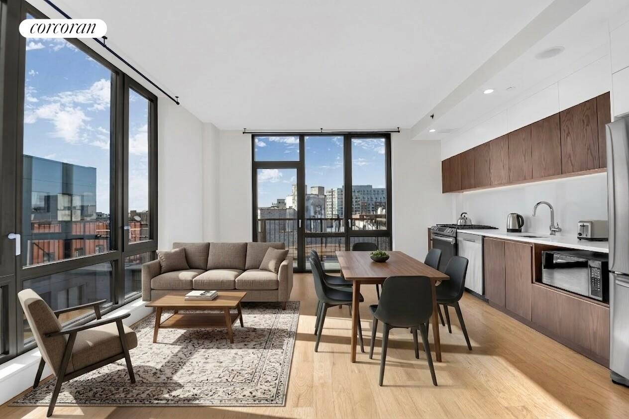 Welcome to Unit 8J, an exceptional, top-floor residence that offers a premium lifestyle in the heart of Brooklyn. This unit maximizes its space, featuring an open concept living and dining area that allows for flexible furniture arrangements and comfortable entertaining. Prepare meals in the marvelous chef's kitchen, complete with stainless steel Samsung appliances and ample cabinetry. Best of all, step out onto your private balcony, ideal for enjoying your morning coffee or unwinding in the evening, with sunset views over Brooklyn. The bedroom is generously sized, easily accommodating a king-size bed, space for a home office setup, and two large closets.