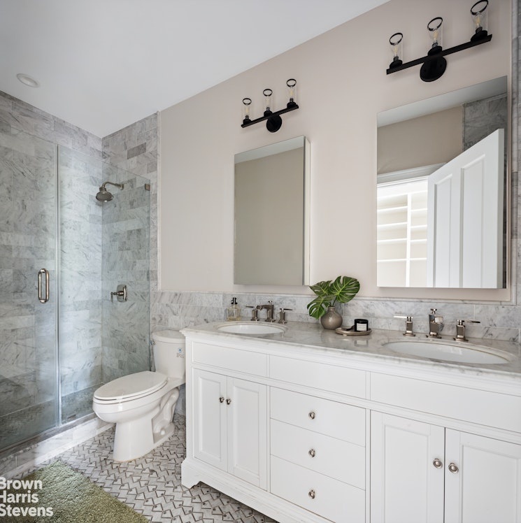 Upstairs, the bedroom floors balance historic charm with modern comfort. Decorative fireplace mantels, hardwood floors, and custom storage solutions elevate each space, while the primary suite offers private access to a large terrace and a spa-like bath with a double vanity, radiant heated floors, and a glass-enclosed shower. Additional bedrooms are spacious and refined, with walk-in closets and beautifully appointed bathrooms.