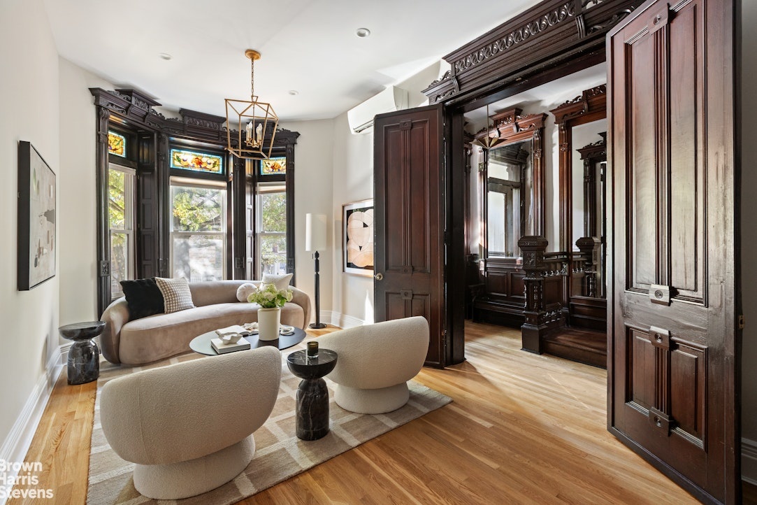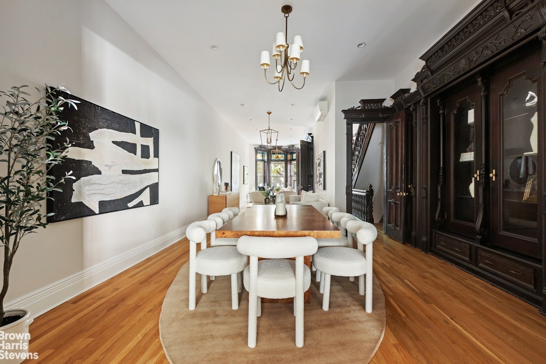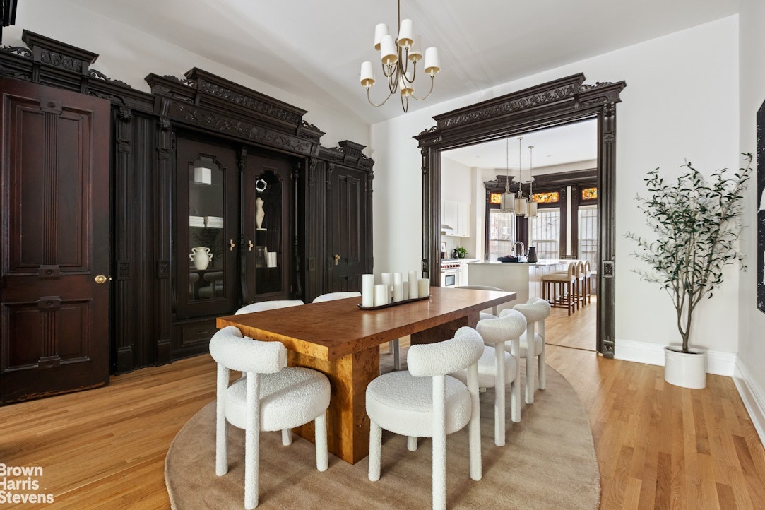 Expertly restored, this home showcases extraordinary attention to detail across every level. The grand parlor floor makes a striking first impression, where restored wainscoting, original moldings, and a sweeping staircase, complete with preserved spindles and a decorative built-in mirror, reflect the timeless grandeur of the space. The formal living room boasts white oak floors and tall windows that flood the interior with light, while the separate dining room provides ample built-ins and elegant trim work ideal for both intimate dinners and larger gatherings.
