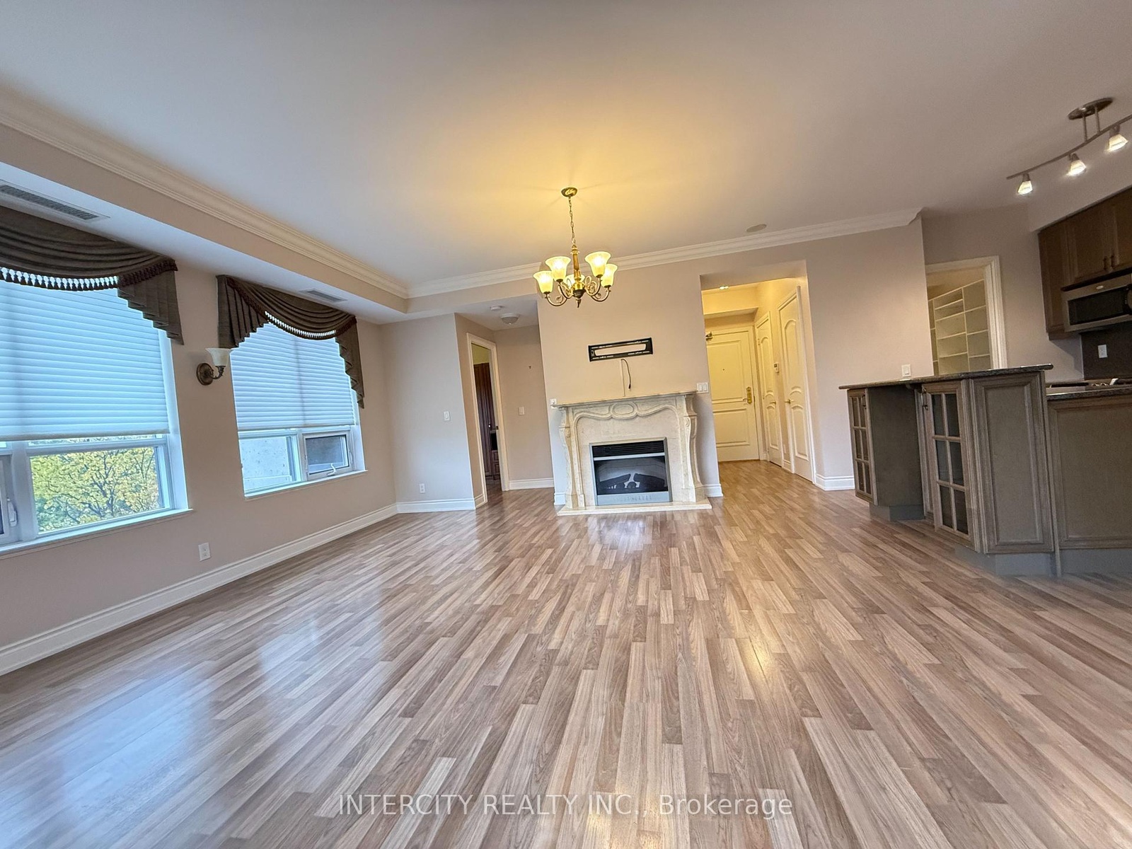 1,060 Sq. Ft. Prime South-East Corner Unit. Suite Overlooks Green Space. Smooth 9Ft Ceiling, Crown Moulding, Marble Fireplace. Kitchen with Ceramic Floor Insert, Granite Back Splash, Counters & Centre Island/Bar, Extended Upper Kitchen Cabinets, Pots & Pan Drawers. Lots Of Windows / Natural Light, Large Balcony. Walk-In Pantry.