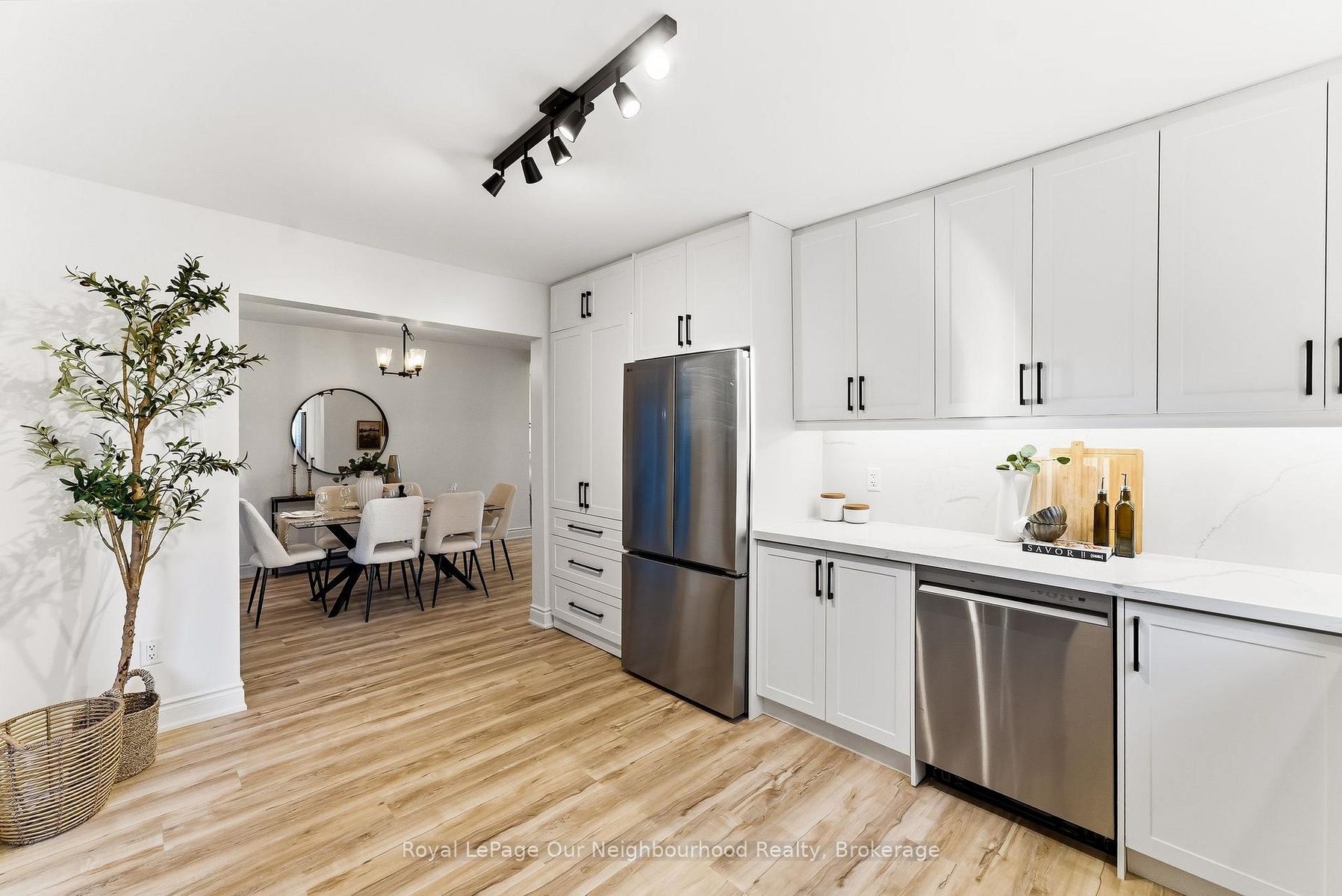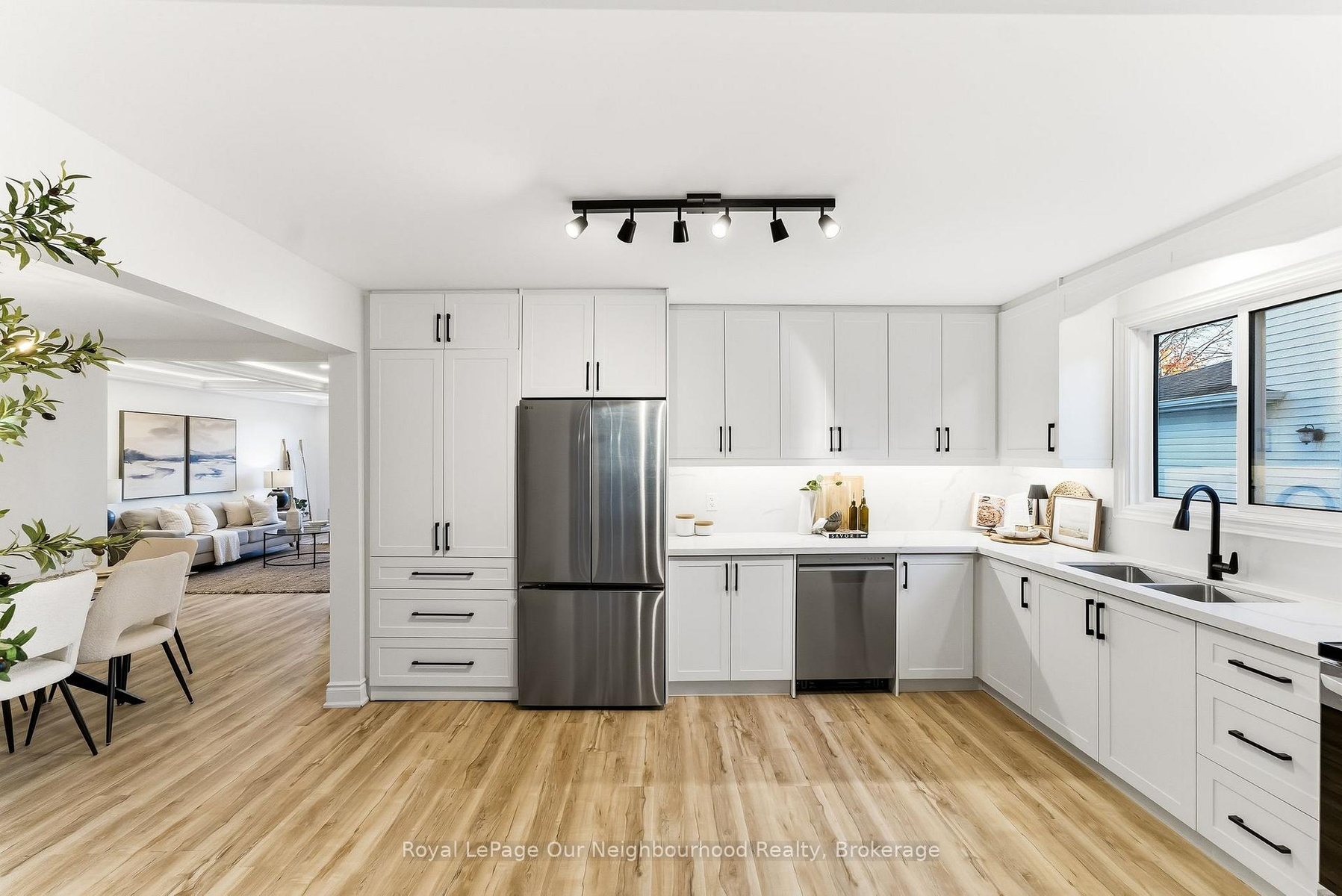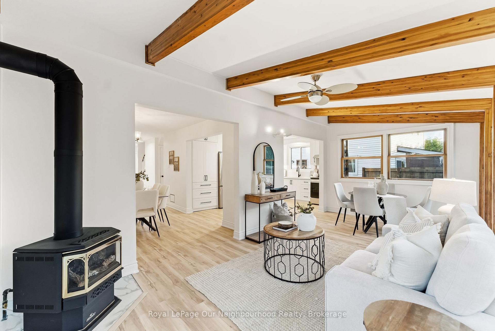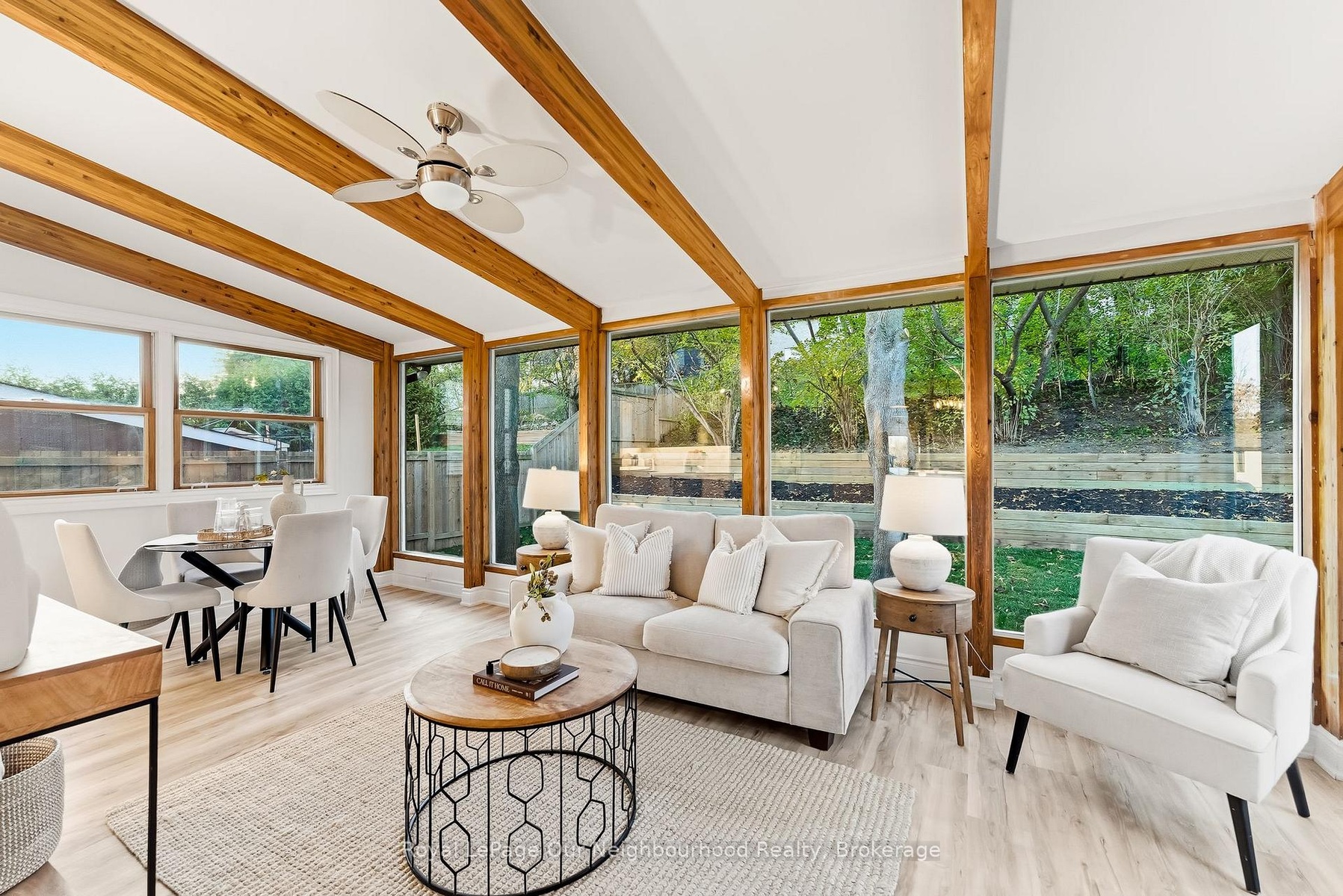 Freshly updated and ready for your family! This exceptionally clean home combines modern design, comfort, and value - a true showstopper on a budget. Ideally located in East Peterborough, close to parks, dog parks, Little Lake, Beavermead Park, the Otonabee River, shopping, and quick access to Hwy 115. Step into the bright white kitchen featuring quartz countertops and backsplash, a hidden walk-in pantry, and brand-new stainless-steel appliances - perfectly designed for both daily living and entertaining. The open-concept living area showcases a waffle ceiling with LED lighting and durable vinyl click flooring, adding both style and practicality. You'll fall in love with the stunning sunroom, highlighted by laminated wood beams, floor-to-ceiling windows, and a cozy gas fireplace - creating a warm, light-filled retreat to enjoy year-round. Upstairs, the primary bedroom offers two separate closets and direct access to a beautifully renovated 4-piece bathroom featuring sconce lighting over a quartz countertop vanity, pot lights, and 24"x24" Carrara-style ceramic tiles throughout - an elegant, spa-like space designed for relaxation. The finished lower level provides a spacious recreation room ideal for a family area, home gym, or office. With modern updates, low-maintenance finishes, and timeless character throughout, this home delivers true move-in-ready comfort.
