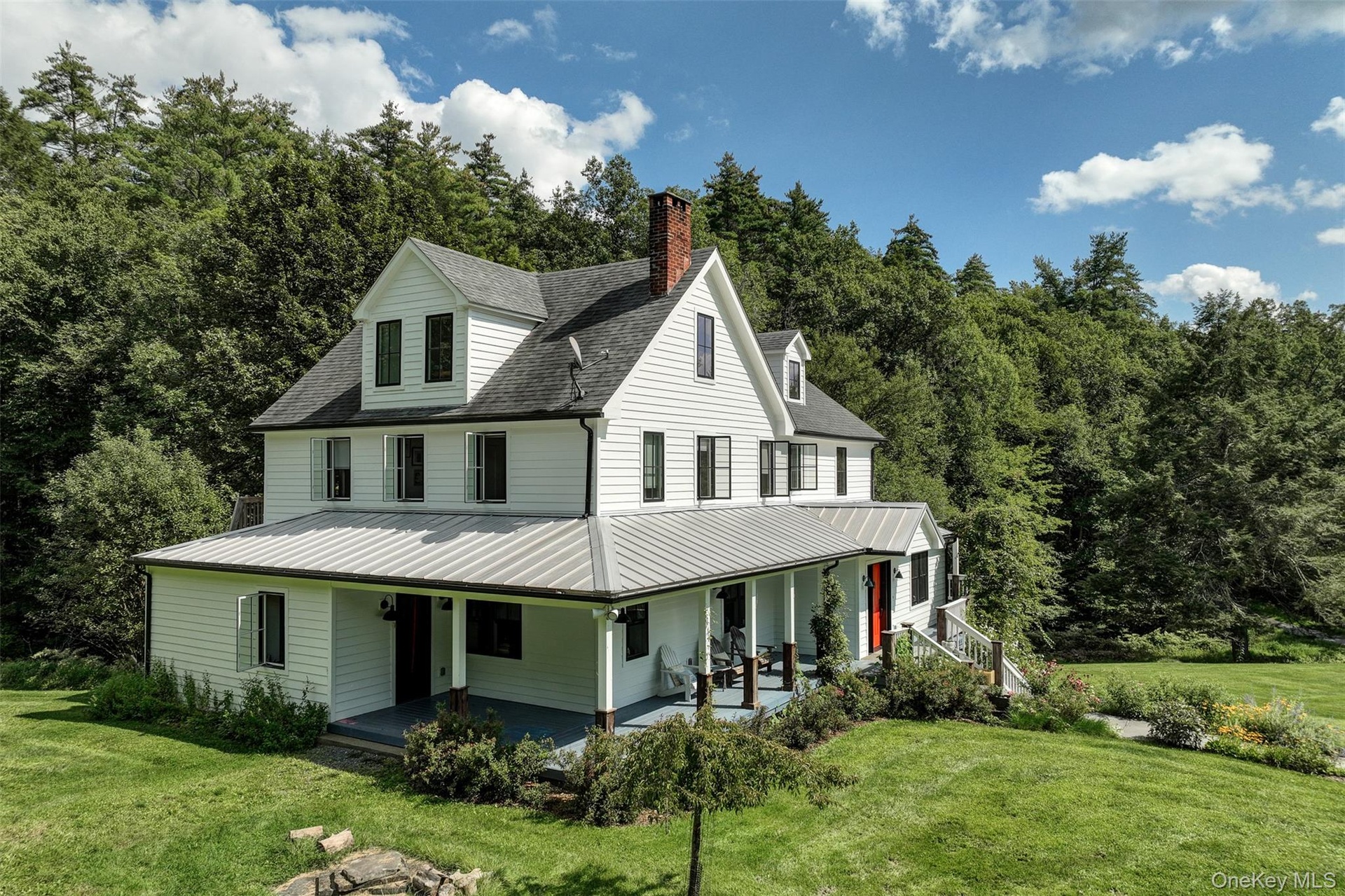 - View of front of property with a porch, a front lawn, a chimney, a forest view, and roof with shingles