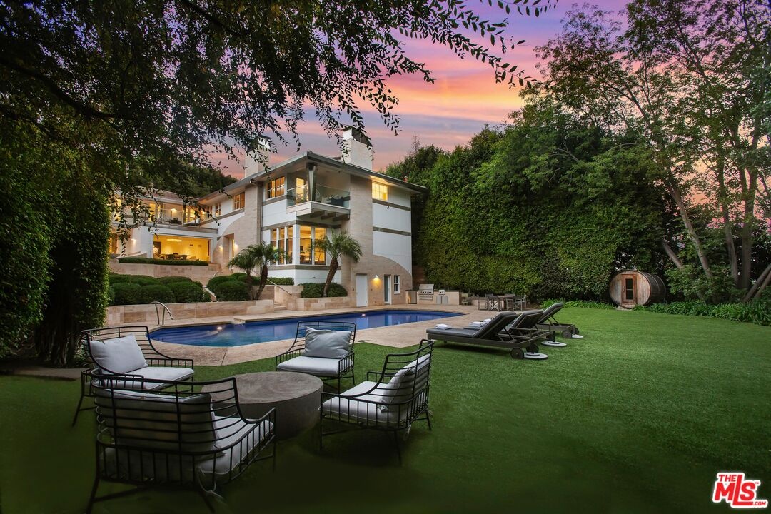 Beverly Hills Tennis Estate property unlike anything you've seen, hidden behind walls, gates & mature trees on over an acre of perfectly manicured park-like grounds in the prime foothills of Beverly Hills. Hosting a rich & elite Hollywood pedigree, up a long driveway on a knoll basking in the sun, sits this entirely reimagined home, colorfully curated by designer Angie Socas Coppel. Each room with its own joyful, lively and inspiring theme with an open floor plan with multiple spaces for entertaining. The main floor features large living spaces, a renovated chef's kitchen with family room, staff quarters and office opening to an outdoor lounge, with Dining and Living rooms opening to the pool and grounds. The 2nd-story consists of three generous bedrooms plus a full primary suite with separate office, lounge, dual bathrooms, dual walk-in closets & French doors that open to a private terrace overlooking the stunning grounds. The sprawling grounds hold a guest house, fully equipped gym, a large pool with separate spa, sauna and a serene, private & sunken championship tennis court. The motor court has parking for up to 25 cars and the property is dialed in with a smart house system, full cameras & security complete with hotel like amenities throughout. A prime compound in one of the world's most desirable locations.