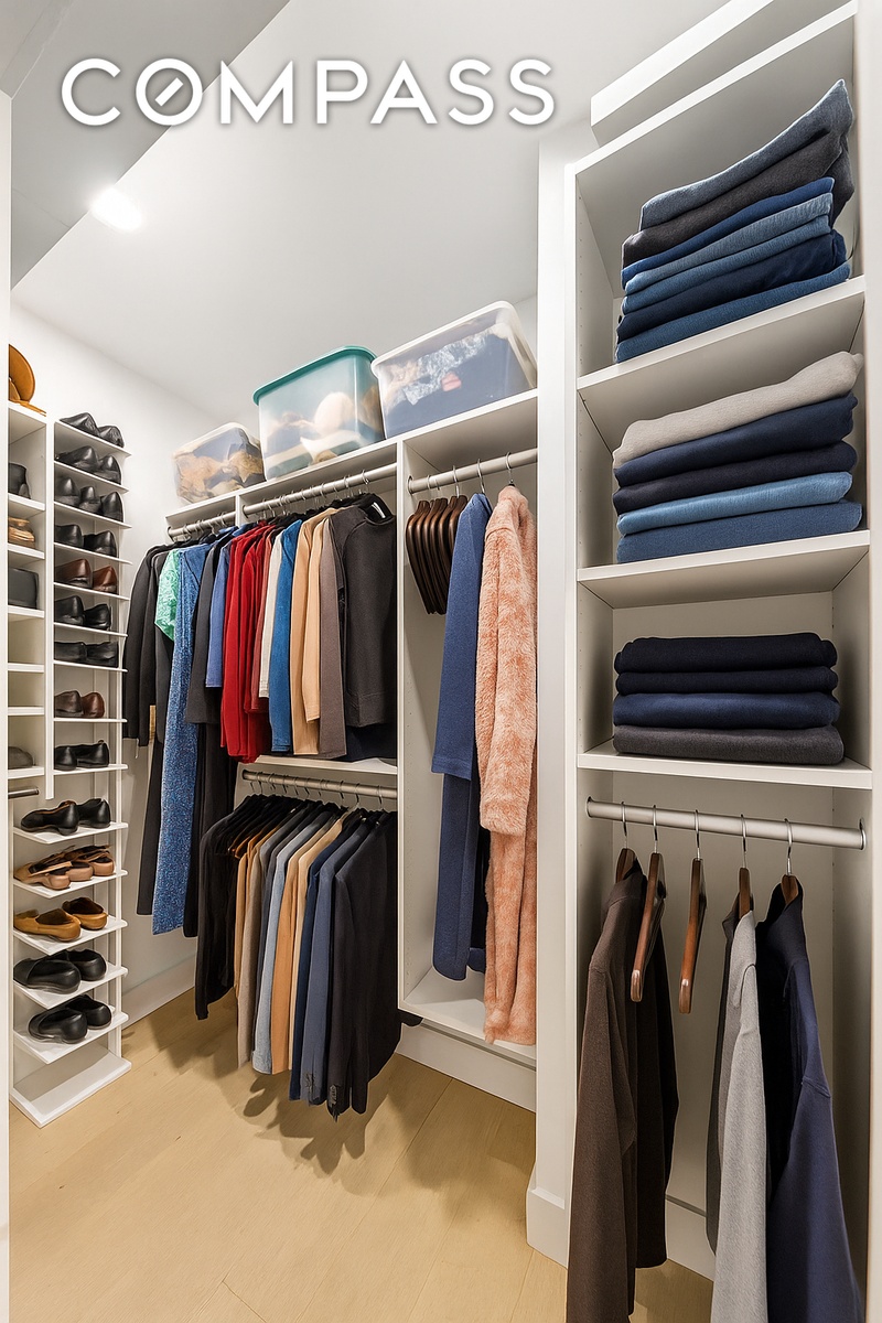 The primary bedroom feels like a true retreat from the city — large enough for a king bed and home office setup, with a sunny south-facing view, beamed ceilings with soffit lighting, and an oversized walk-in closet. The en suite bath sits behind a barn door and is done entirely in pristine marble. It includes plenty of storage and a gorgeous decoratively tiled shower that feels like a spa (and is big enough to fit four people).