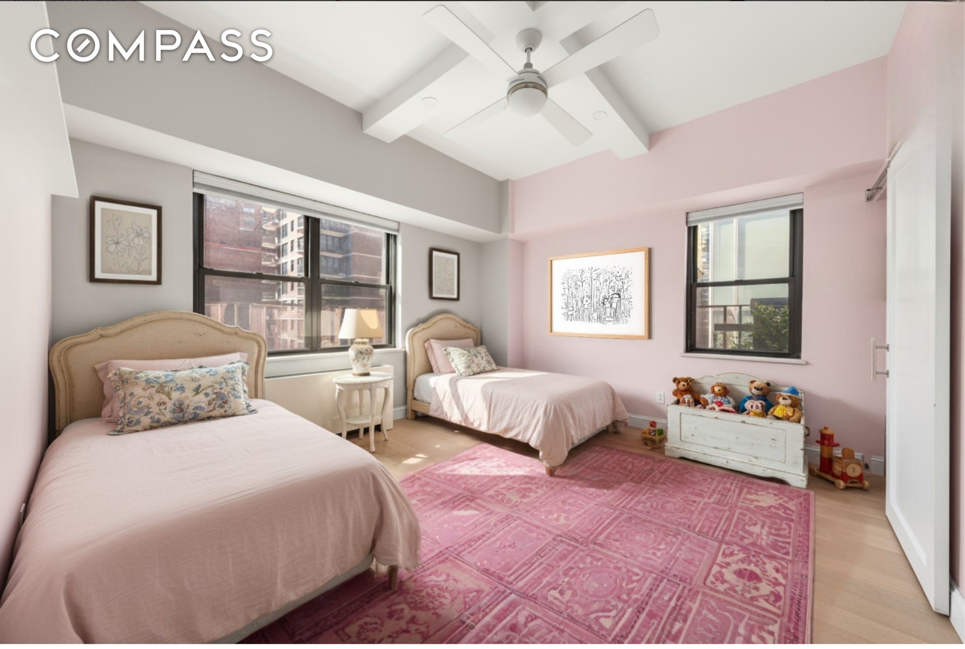 Down the hall, you’ll find more closet space and a ventless Miele washer/dryer tucked into a huge storage closet. The second bedroom gets great light with both south and west exposures, fits two kids comfortably, and includes its own windowed walk-in closet. The guest bath has a tub and timeless marble finishes.